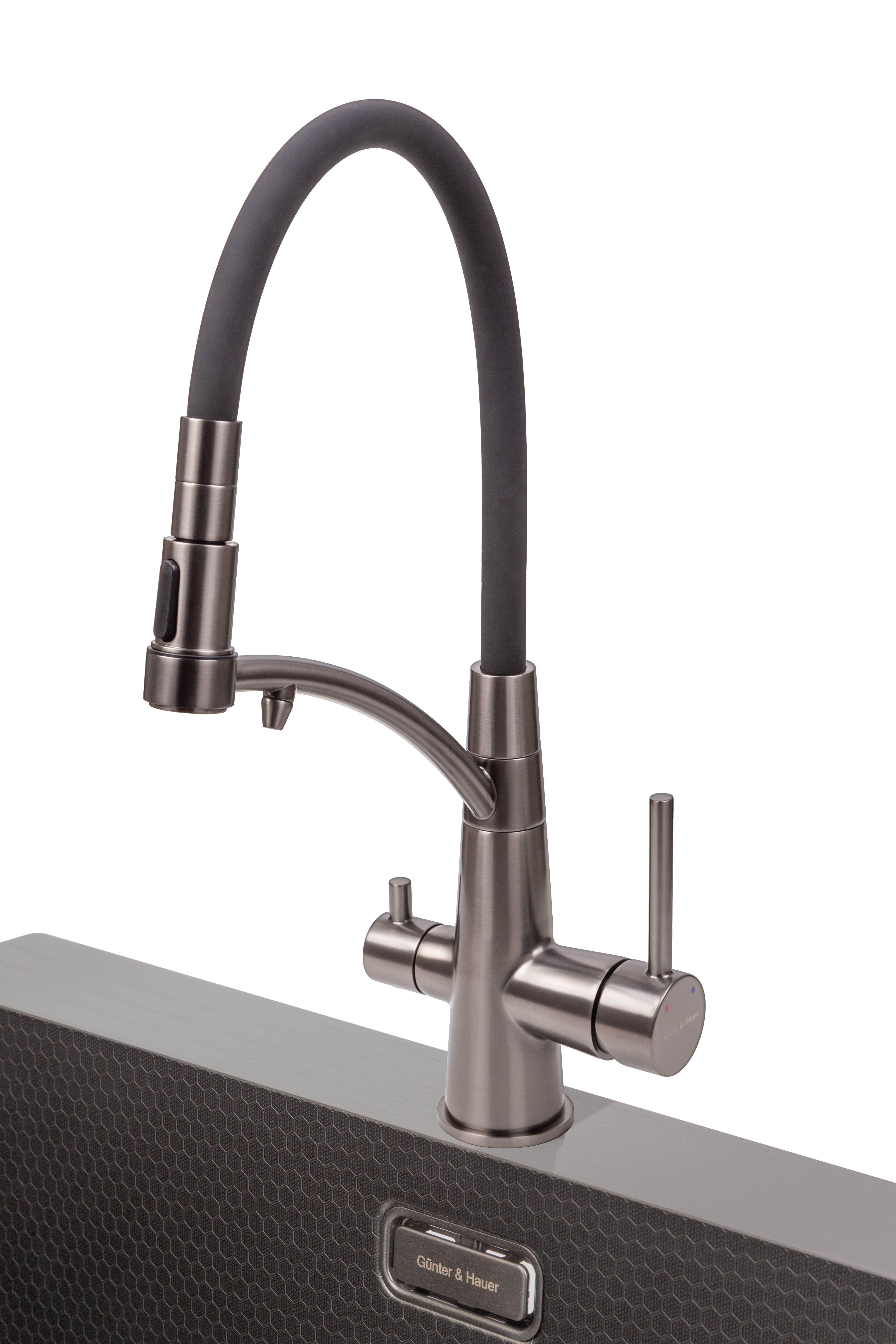 Gunter Hauer FEST Gun Metal – это смеситель, сочетающий в себе современный дизайн, высокий уровень удобства и стильный вид. Поверхность в цвете Gun Metal с матовым оттенком создает элегантный блеск, подчеркивающий характер кухни – современной, индустриальной или хай-тек. Два рычага управления позволяют легко изменять температуру и режим потока — для обычной и фильтрованной воды, поэтому весь функционал под рукой.