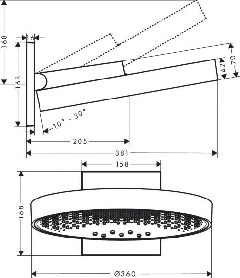 | Особенности | душевой кронштейн вертикально наклоняется на 10-30°, тип распылителя: PowderRain, Intense PowderRain, RainStream |