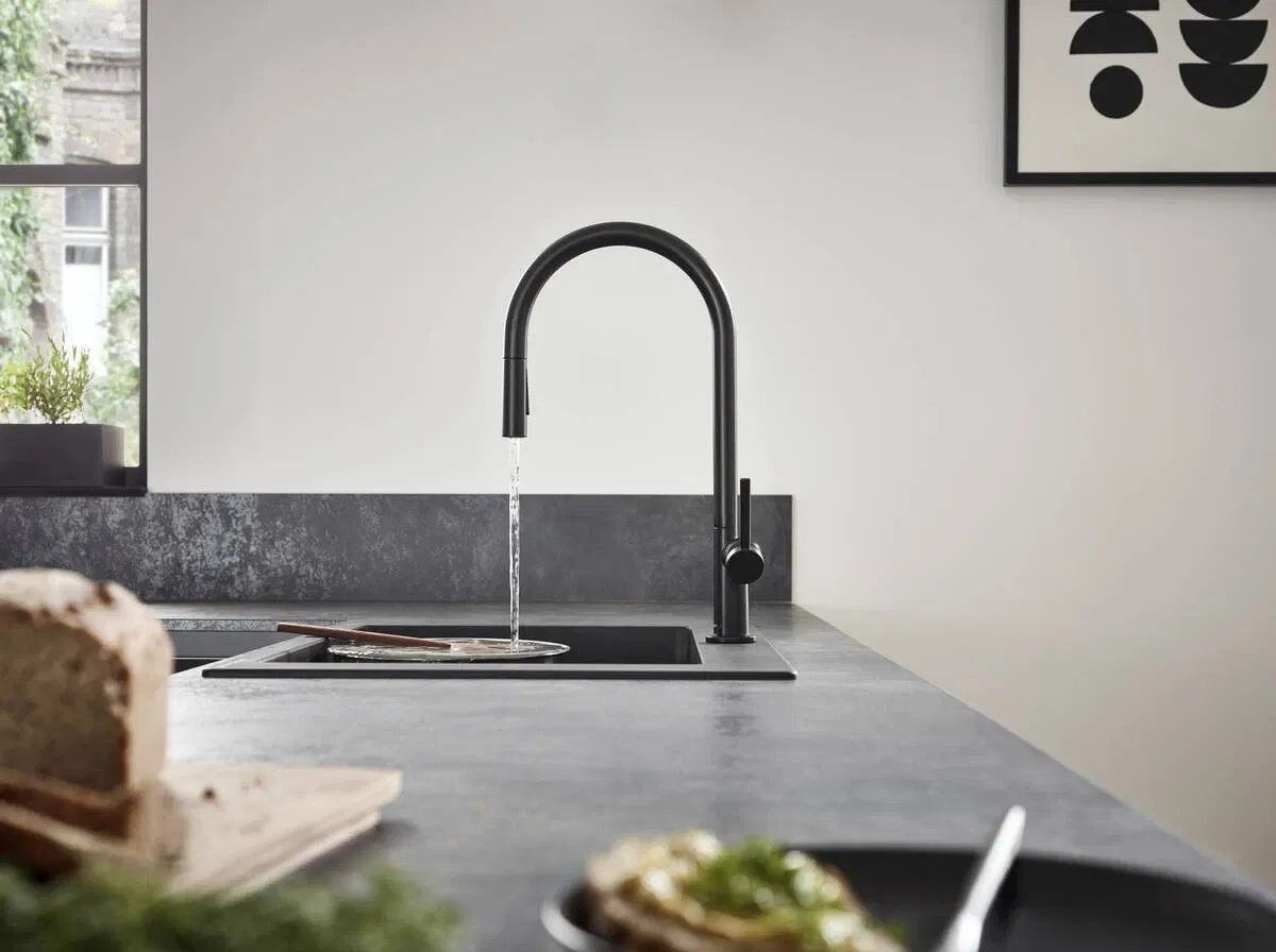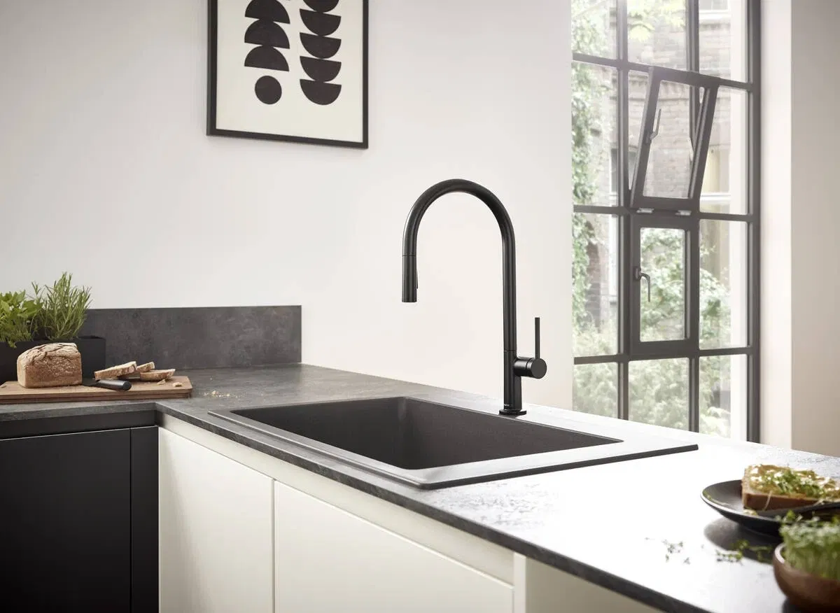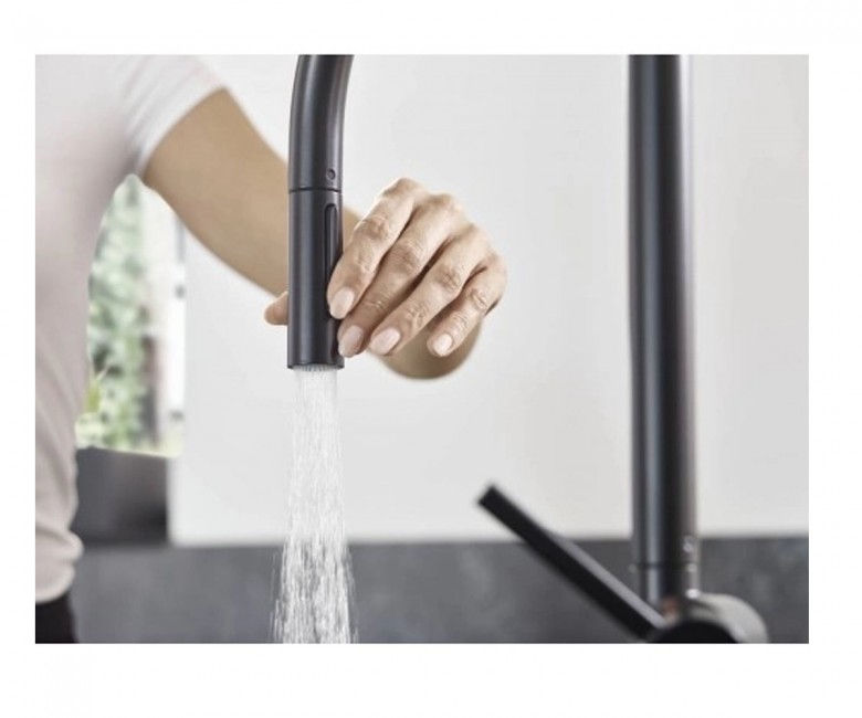 Особенностью является выдвижной душ, позволяющий удобно ориентировать поток воды там, где это нужно – например, при мытье больших предметов или наполнении высоких емкостей. Отделка в цвете черный матовый придает изделию современный и стильный характер, что делает смеситель не просто функциональным элементом, а дизайнерской деталью кухонного пространства.