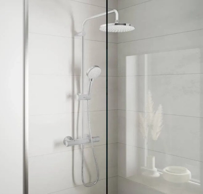 Vernis Blend 220 26276000 от Hansgrohe состоит из однорежимного, круглого верхнего душа диаметром 20.5 см, кронштейна верхнего душа длиной 34.4 см, двухрежимной, круглой ручной лейки диаметром 10.8 см с душевым шлангом в металлической оплетке длиной 160 см, душевой штанги высотой (с установленным кронштейном) 112.4 см, регулируемого по высоте держателя для ручной лейки и двухвентильного термостатического смесителя для душа с переключателем на 2 потребителя. Смеситель имеет нижний отвод для подключения душевого шланга под диаметр 1/2 дюйм и устанавливается на 2 отверстия посредством эксцентрикового соединения под диаметр 1/2 дюйм.