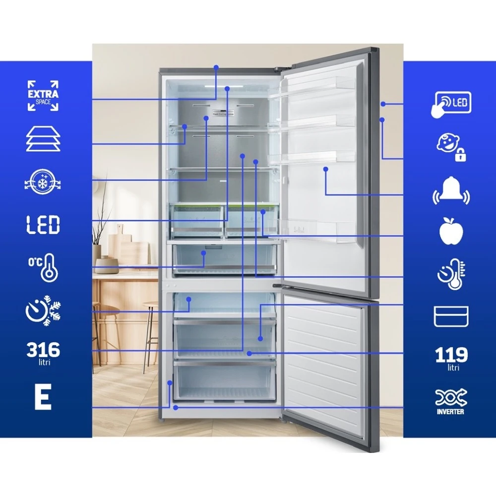 HEINNER HCNF-M435INVHXE++ предлагает ряд фирменных технологий, таких как FreshBox 0C, SuperCool, SuperFrost и InoxCool, повышающие качество хранения продуктов. Функции суперохлаждения и быстрой заморозки обеспечивают быстрое охлаждение и замораживание, что незаменимо при хранении большого количества продуктов. Технические особенности включают детскую блокировку, перевешенную дверцу, дисплей, оповещение о незакрытой дверце и сигнал неисправности, что повышает безопасность и удобство пользования. LED освещение обеспечивает яркое и энергоэффективное освещение внутреннего пространства.