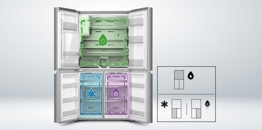 Hisense RQ760N4AIF — стильный холодильник в формате multi-door, сразу создающий ощущение пространства и организованности. Он позволяет комфортно размещать продукты так, чтобы все было видно и легко доступно – от ежедневных продуктов до больших емкостей или нескольких лотков свежих овощей. Дизайн дверцы типа cross-door не только выглядит премиально, но и обеспечивает эффективную организацию внутреннего пространства.