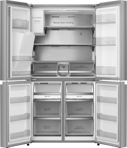 Дозатор для воды и льда. Этот очень удобный льдогенератор и дозатор воды, расположенный на дверце, может производить 2,2 литра льда в день для всей семьи. Вы сможете выбирать нужный вам режим (кубики, измельченный лед или охлажденная вода) в любой момент, не открывая дверцу холодильника Хайсенс. Наслаждайтесь прохладительными напитками без лишних забот. Зону My Fresh Choice можно легко перевести с режима холодильной камеры на морозильную, изменяя значения температуры в диапазоне от –20 °C до +5 °C, в зависимости от того, что нужно хранить. Установив нужную температуру, вы создадите идеальную среду для ваших продуктов, чтобы они дольше сохраняли свою свежесть и вкус. Задняя стенка холодильника Cross Door с четырьмя дверцами покрыта нержавеющей сталью, что обеспечивает равномерное распределение холодного воздуха внутри холодильной камеры. Это сочетание передовых технологий всегда обеспечивает идеальный уровень температуры и влажности. Для продолжительного хранения продуктов свежими и обеспечения организованного пространства одновременно в этом холодильнике с морозильной камерой и четырьмя дверцами есть несколько ящиков. К вашим услугам два больших контейнера для фруктов и овощей, отделение для закусок и ящик для свежих продуктов (рыба, мясо, молочные) полноценного размера. Холодильник с большим объемом холодильной и морозильной камеры обеспечивает достаточно места для хранения продуктов любой формы и типа. А четверо широко открывающихся дверей позволяют увидеть все сразу. Технология Multi Air Flow равномерно распределяет холодный воздух, что позволяет постоянно поддерживать оптимальный уровень температуры в вашем холодильнике. Это обеспечивает идеальное охлаждение продуктов независимо от их места хранения. Функция Super Cool Hisense способна быстро снизить температуру внутри отделения холодильника и поддерживать ее на уровне +2 С в течение 6 часов. Это отличный способ сохранения вкуса, цвета и пищевой ценности свежих продуктов.
