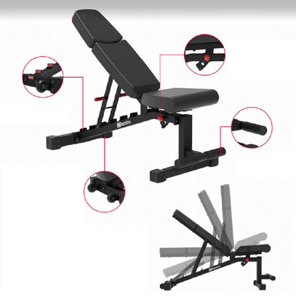 Эргономичная трех-секционная конструкция скамьи с регулируемой спинкой и прижимной планкой для ног, обеспечивают самую прочную и эффективную скамью.