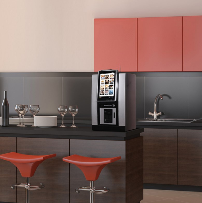 Jetinno JL28 — это настольная автоматическая кофемашина с сенсорным экраном и небольшим встроенным диспенсером для чашек. Рассчитана на приготовление более 20 напитков, в том числе эспрессо, американо, капучино, мокко, молоко, шоколада и даже чая, поэтому станет отличным решением для офиса или кофейной точки. За день готовит до 150 чашек.