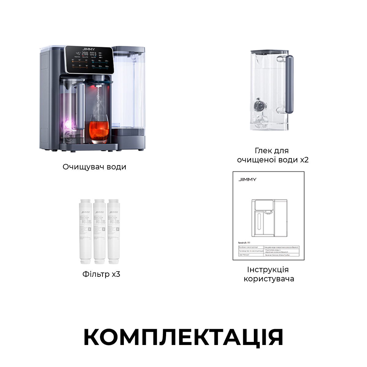 | Комплектация | очиститель воды, фильтр х3, кувшин для очищенной воды х 2, инструкция пользователя, краткое руководство пользователя |
