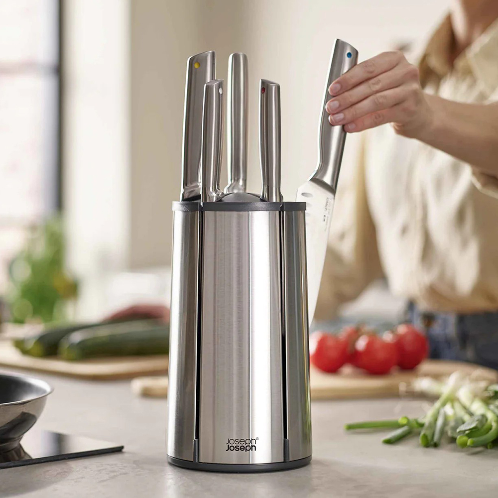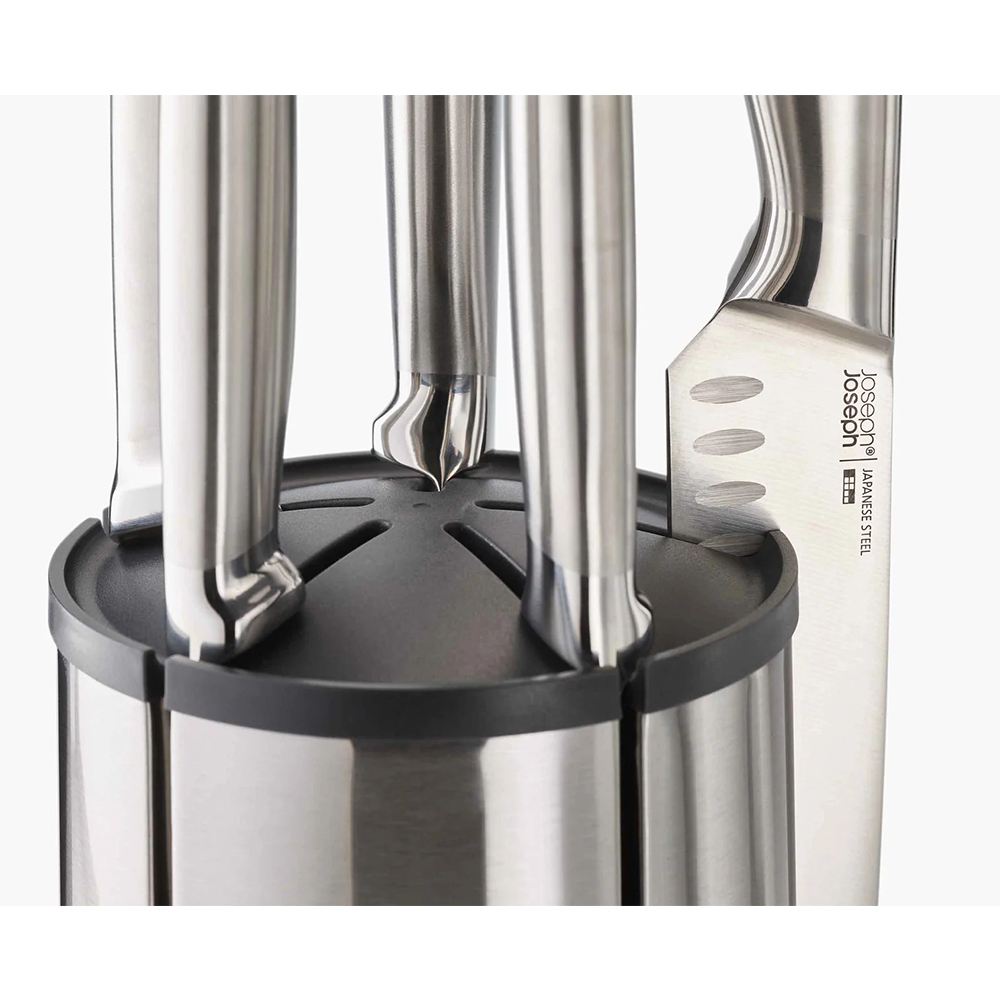 Набор ножей от английского производителя Joseph Joseph создан для современной и функциональной кухни, где всё находится под рукой. В этот высококачественный набор входят пять основных кухонных ножей и вращающийся блок из нержавеющей стали с магнитными прорезями для ножей.