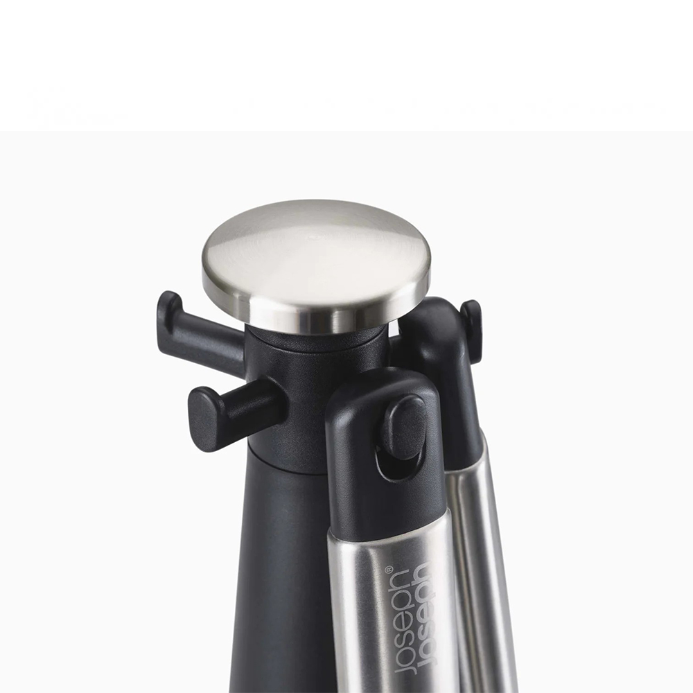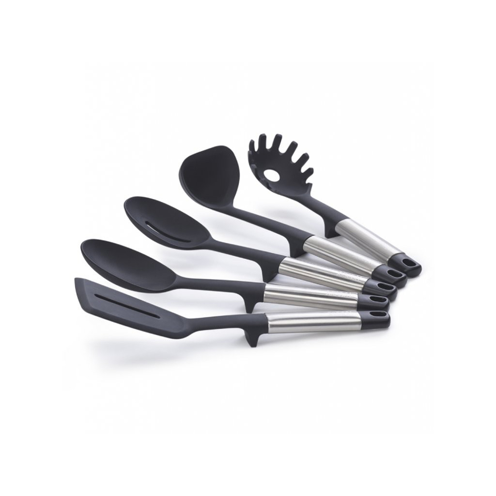 Посуда Elevate была разработана для улучшения гигиены и минимизации беспорядка, возникающего вследствие размещения посуды на кухонных поверхностях при использовании. Каждый инструмент имеет отягощенную рукоятку с интегрированной опорой для инструмента, которая предотвращает касание головки рабочей поверхности, когда она уложена вниз. В этом наборе из 5 предметов есть посуда с термостойкими силиконовыми головками и изящными ручками из нержавеющей стали, а также вращающаяся подставка для хранения с нескользким основанием для легкого выбора инструментов. Насадки термостойкие до 210C и пригодны для использования со всеми типами посуды, включая антипригарную. В набор входит пять основных предметов посуды, включая твердую ложку, шумовку, лопатку с прорезями ложку для спагетти и черпак.