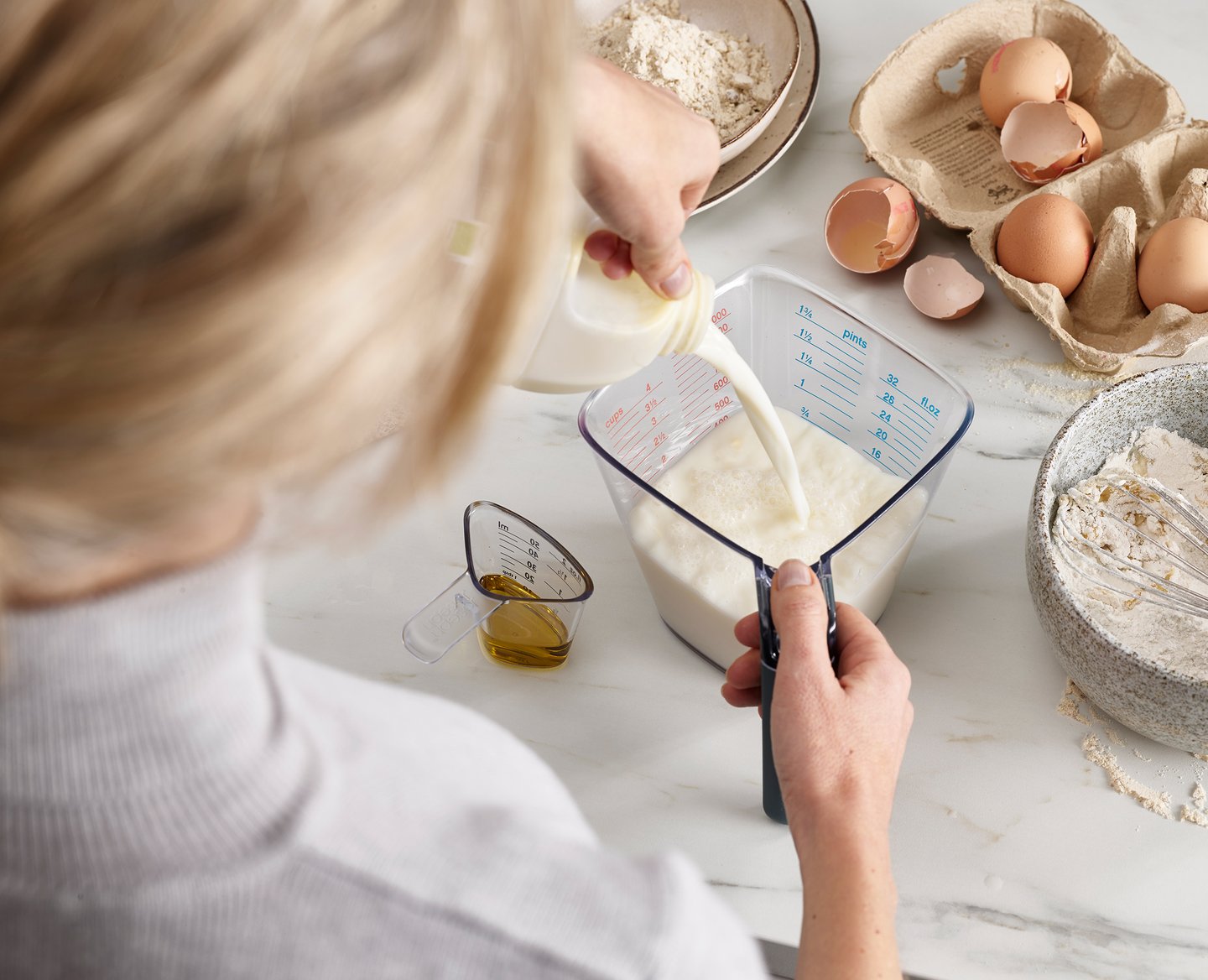 Нет необходимости наклоняться, чтобы прочитать этот большой мерный кувшин, поскольку он имеет угловую конструкцию с четкими измерениями, что позволяет вам считывать объем сверху, когда вы наливаете.