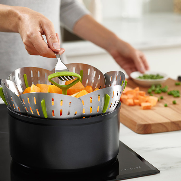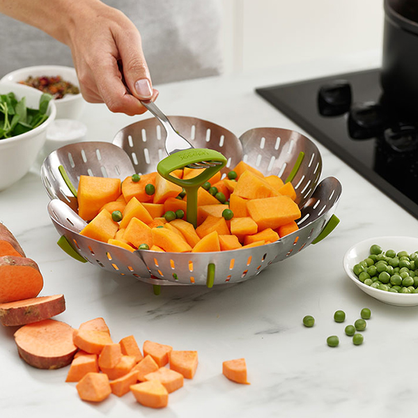 Складная пароварка Joseph Joseph Bloom 45033 изготовлена из высококачественного полипропилена и нержавеющей стали, имеет регулируемые стороны, что позволяет ей подходить к разному размеру кастрюль. Также может использоваться как дуршлаг или даже как ваза для конфет.