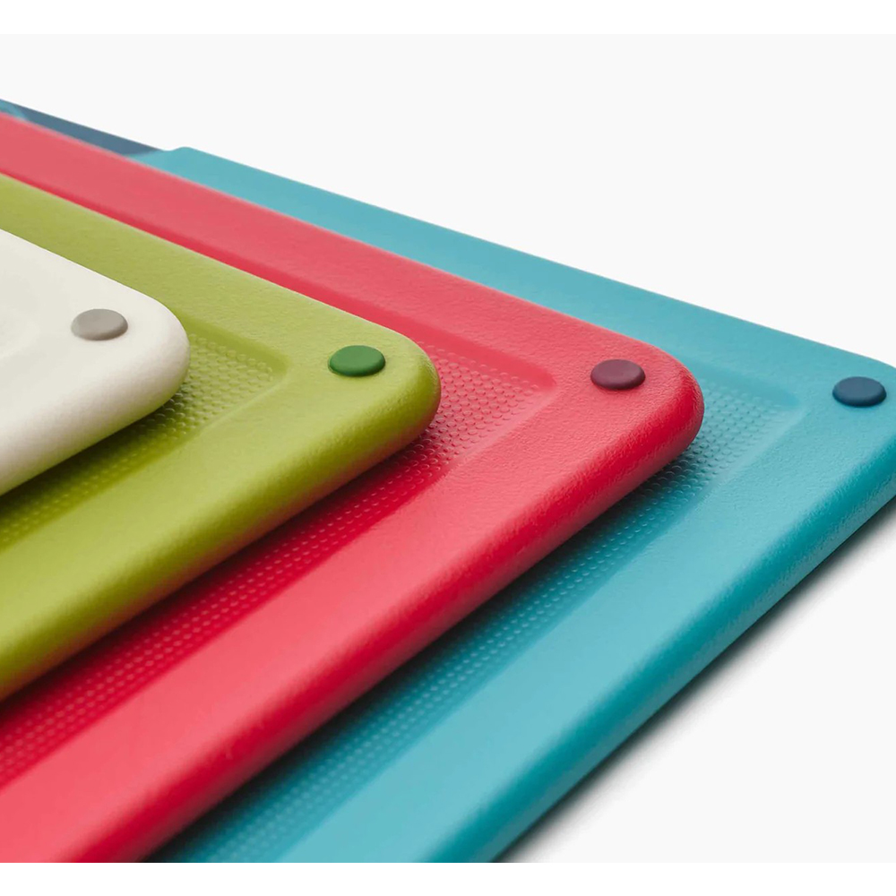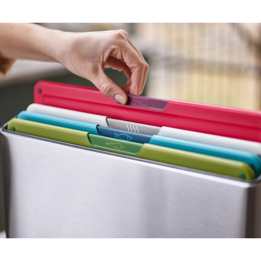 Этот потрясающий дизайн имеет тонкий корпус из нержавеющей стали, в котором прекрасно организованы четыре большие разделочные доски для определенной пищи и настоящее впечатление на рабочей поверхности. Каждая цветная доска имеет удобную для ножа текстурированную режущую поверхность с обеих сторон, нескользящие ножки и значки, указывающие, для какого типа пищи их следует использовать - сырого мяса, сырой рыбы, овощей или вареной пищи. Их можно легко вынуть из футляра благодаря продуманной конструкции под углом, и они аккуратно держатся друг от друга, позволяя воздуху циркулировать. Чехол имеет покрытие, которое не дает отпечатков пальцев, что облегчает очистку, а ножки не скользят по основе.