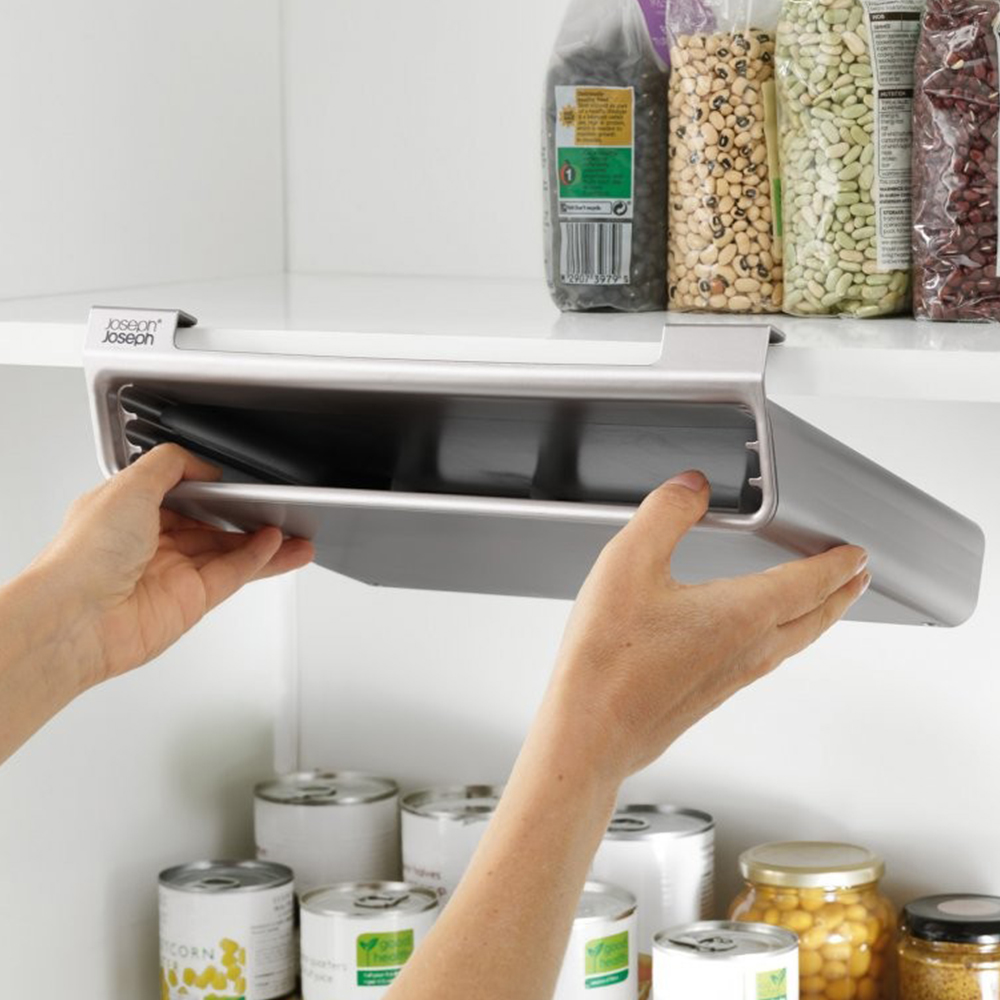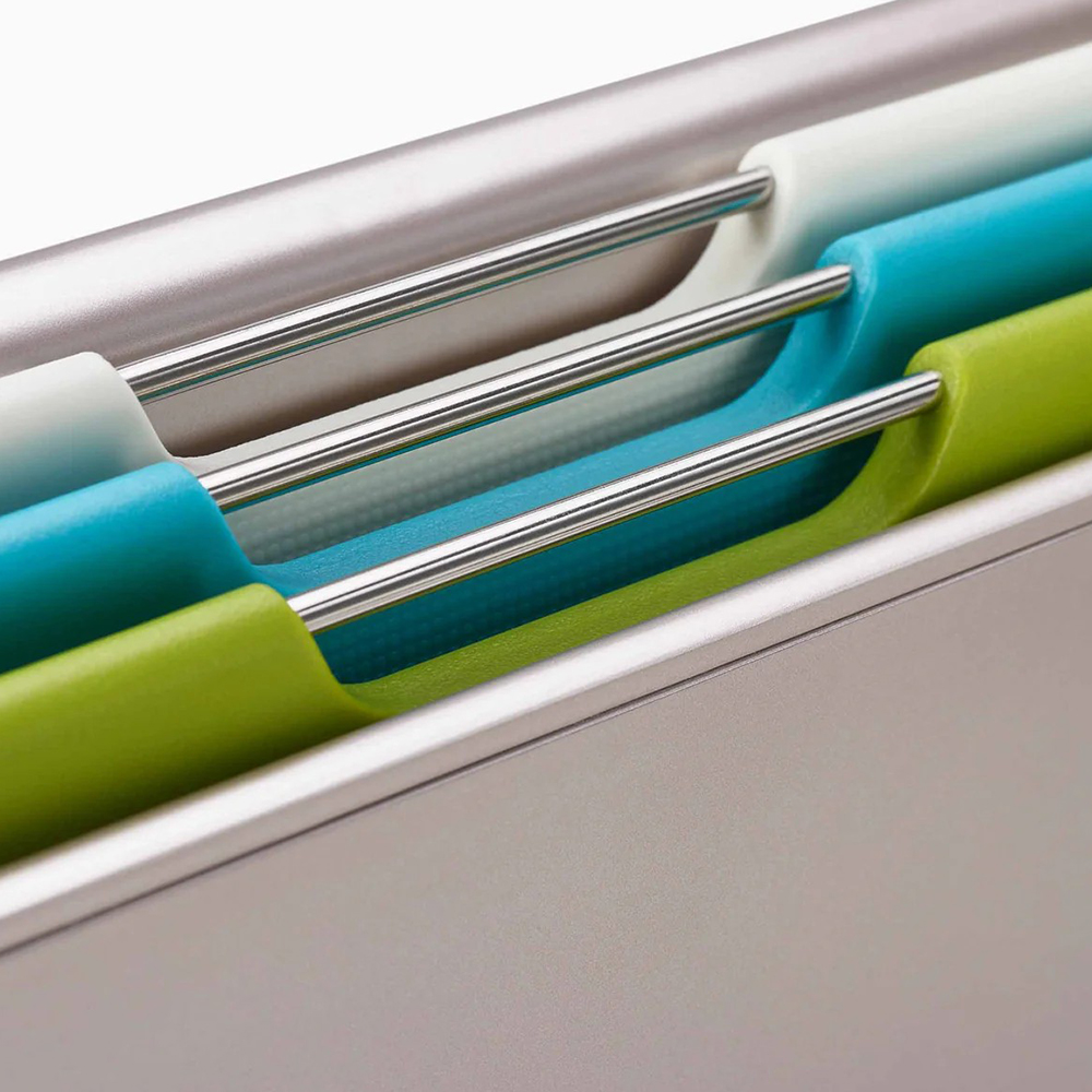 Набор разделочных досок под полку Folio от Joseph Joseph этот инновационный набор разделочных досок эффективно использует пустующее пространство под полкой, тем самым максимально используя каждый сантиметр площади шкафа. В набор входят три разделочные доски с цветовой маркировкой и удобными для ножей текстурированными режущими поверхностями с обеих сторон, стержень из нержавеющей стали и нескользящие ножки. Они хранятся внутри тонкого футляра для хранения, который крепится к существующей полке и крепится сзади двумя маленькими винтами (входят в комплект).