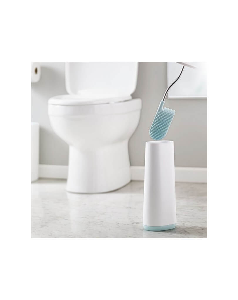 Ершик Joseph Joseph Flex не похож на те ершики, которые вы видели раньше. Головка щетки гибкая и выполнена в D-образной форме, благодаря чему вычищает даже под ободком. Щетины резиновые, далеко расположены друг от друга, поэтому между ними не собирается грязь.