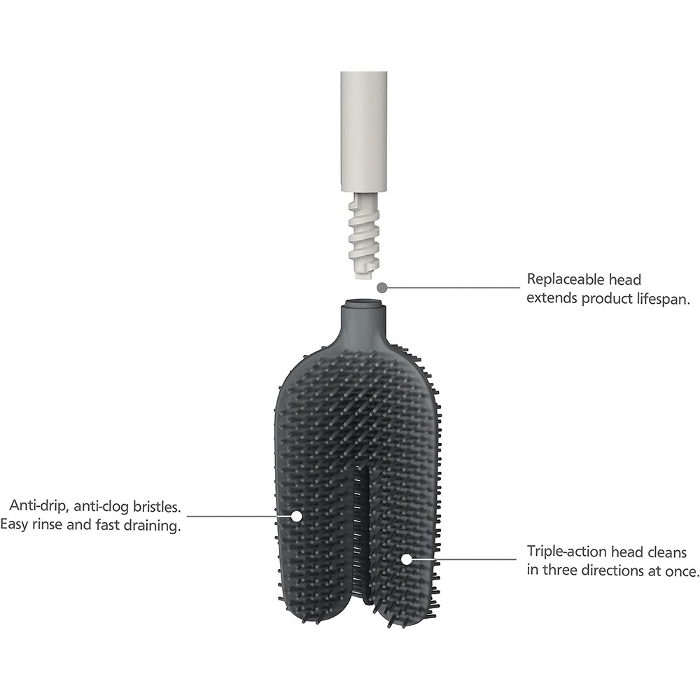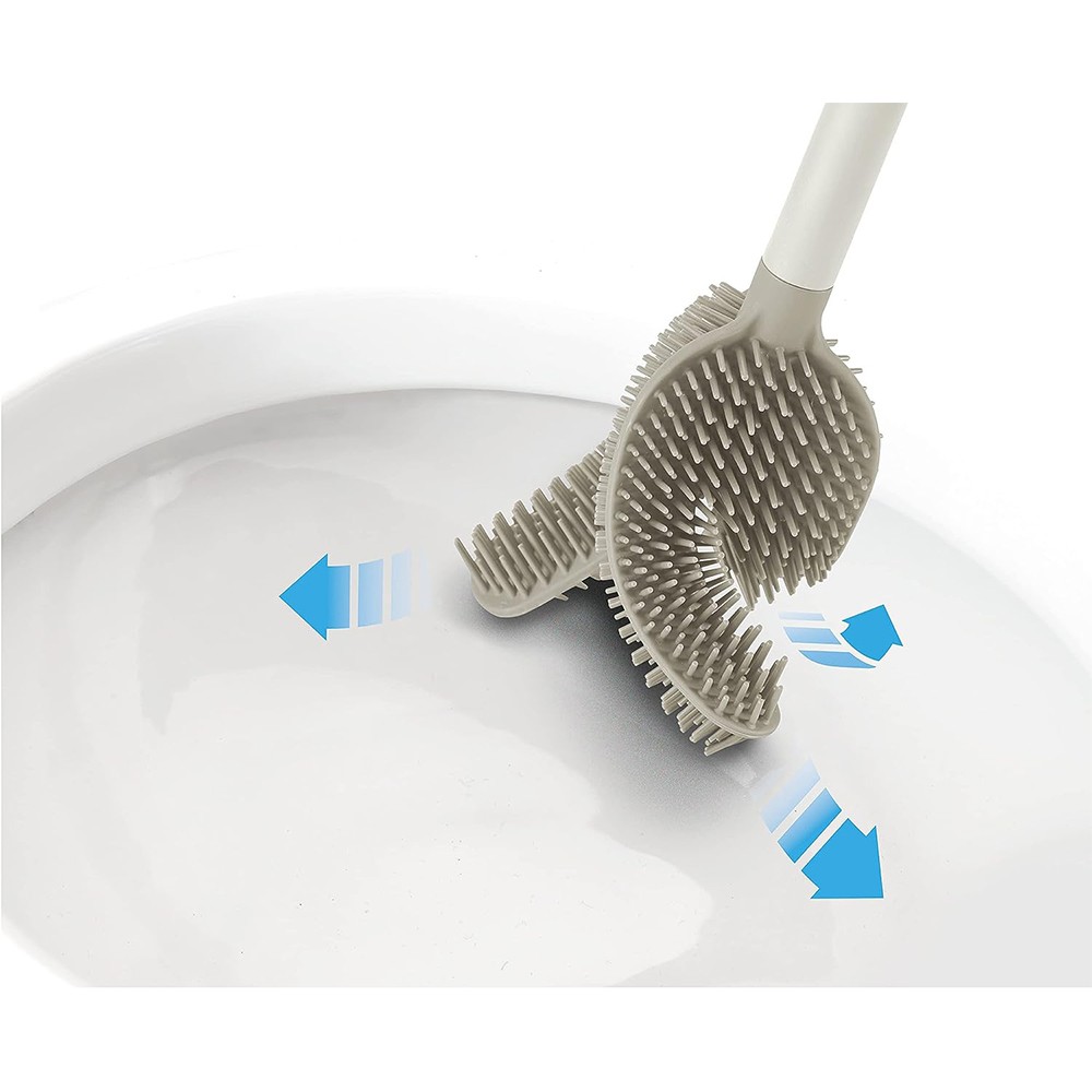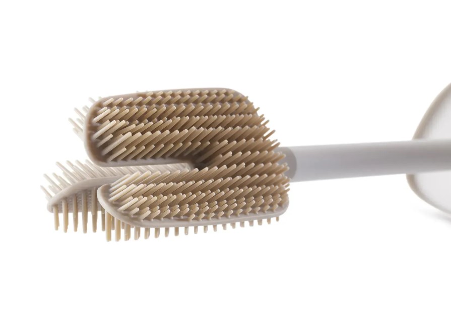 Обычные туалетные щетки содержат грязь и жидкость, что делает их негигиеническим при использовании и чистке. Кроме того, их щетина может деформироваться и изнашиваться, поэтому нужно регулярно менять их. Эта усовершенствованная туалетная щетка имеет гибкую головку тройного действия, очищающую в трех направлениях одновременно. Она имеет широко расположенные щетки, которые предотвращают засорение, позволяют жидкости быстро стекать и являются более прочными, чем обычные щетки.