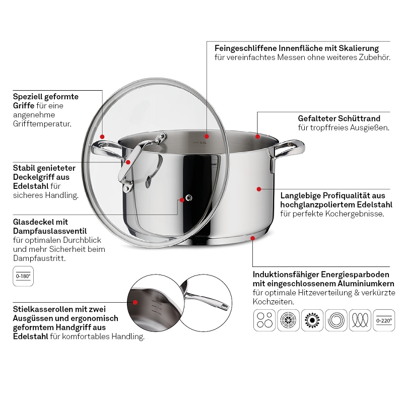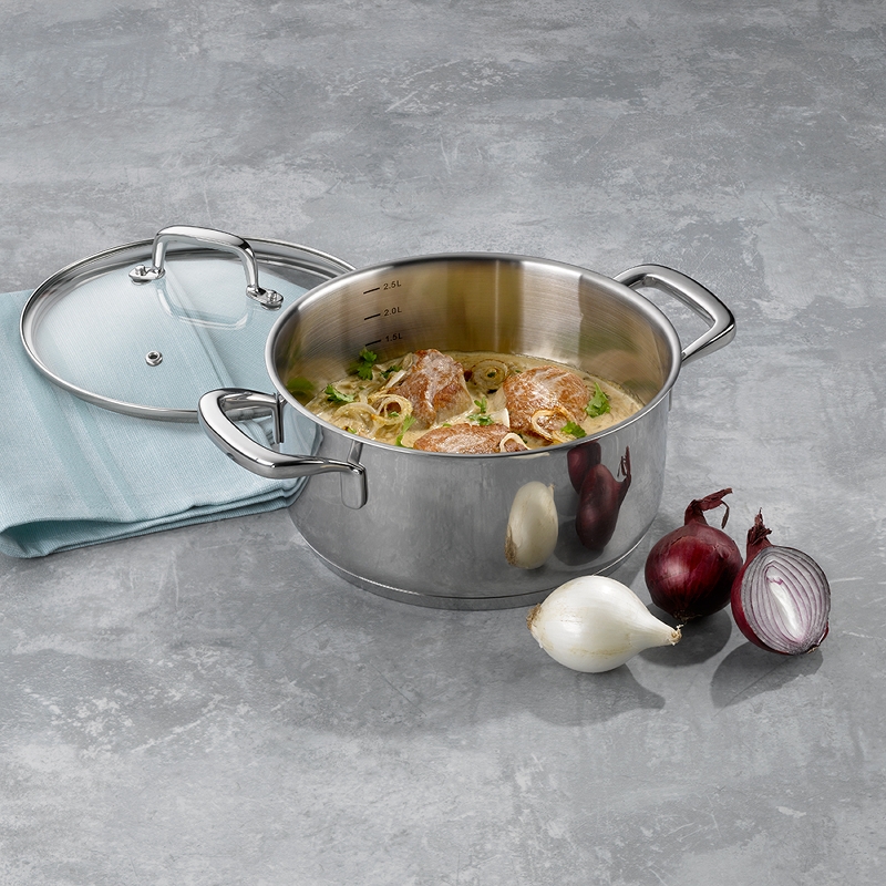 Кастрюля идеальна для запекания, тушения и тушения мяса, изготовлена из нержавеющей стали 18/10 и имеет стеклянную крышку с ручкой из нержавеющей стали.