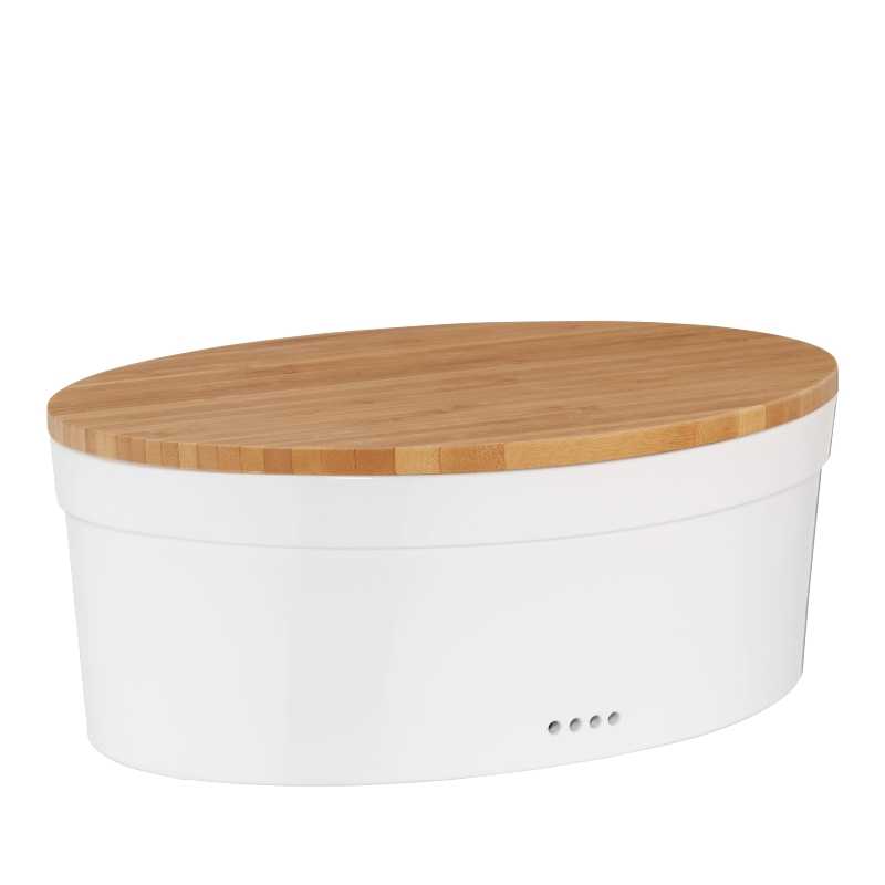 Эта овальная хлебница доступна исключительно в белом цвете . Внешняя, яркая особенность и элемент дизайна серии - воздушные отверстия по бокам. Стабильная крышка изготовлена из бамбука и является съемной. Бамбуковая крышка небезопасна для мытья в посудомоечной машине!