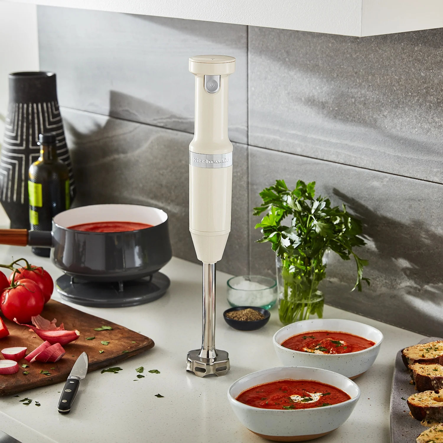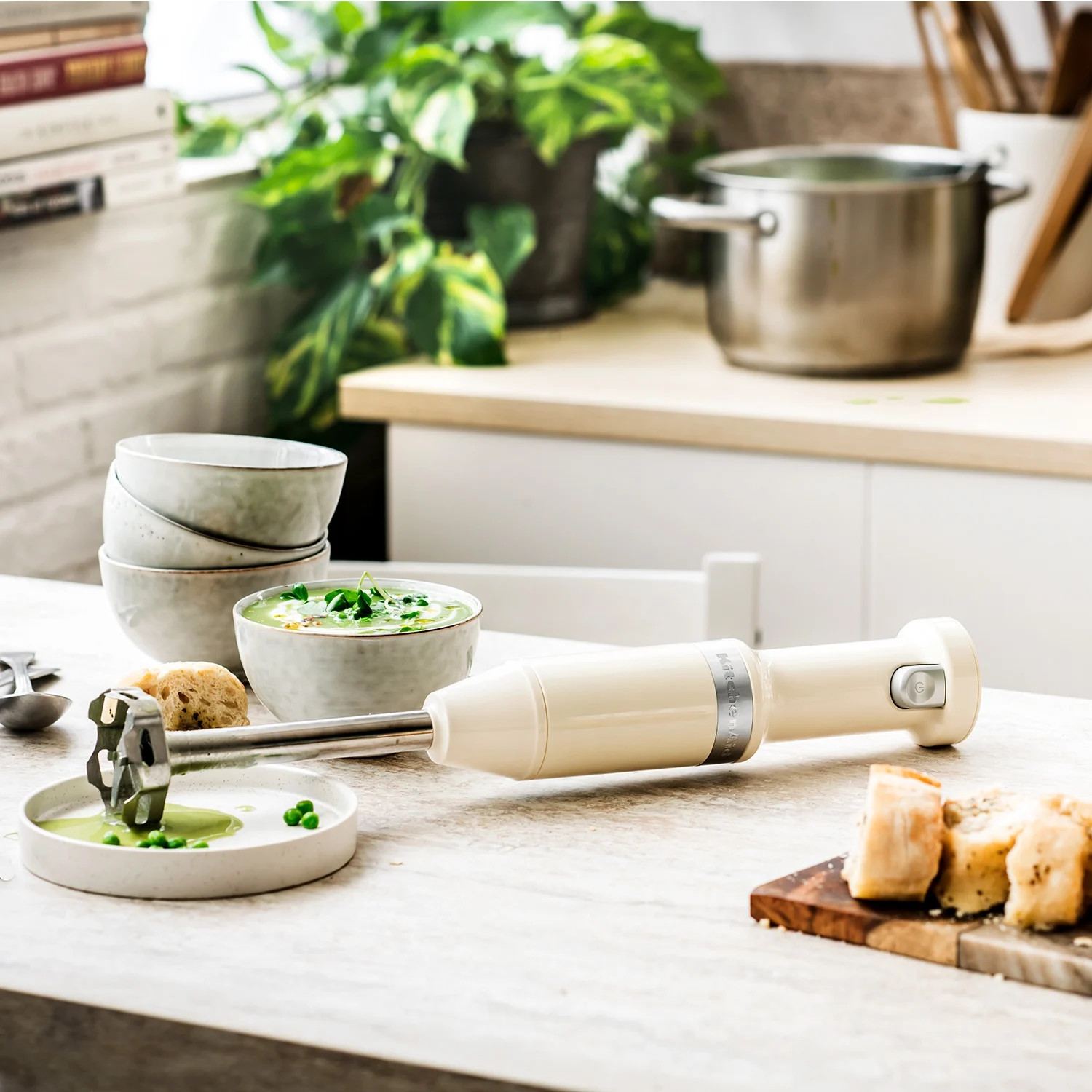 Аккумуляторный ручной блендер 5KHBBV53EAC из коллекции Cordless – удобное и практичное устройство – им можно управлять одной рукой, а входящие в комплект аксессуары (чашка на 0.7 л, крышка) позволят легко хранить ингредиенты и блендер. а крышка дополнительно защитит посуду от повреждений, что несомненно облегчит вашу работу на кухне. Благодаря простому дизайну и матовому черному цвету блендер выглядит чрезвычайно элегантно и идеально подходит для современной кухни. Устройство оснащено литий-ионным аккумулятором, что обеспечивает оптимальное время работы и эффективность — при полной зарядке можно приготовить 25 тарелок супа. Специальный индикатор проинформирует вас о расходе заряда батареи. Зарядка блендера не вызовет никаких проблем, зарядка аккумулятора с нуля до полного — благодаря специальному зарядному устройству, совместимому со всеми продуктами коллекции — займет максимум 2 часа. Съемный рычаг блендера длиной 20 см с защелкой Twist-Lock оснащен лезвием из нержавеющей стали, что позволяет эффективно измельчать и перемешивать различные типы ингредиентов. Также блендер имеет безопасную двойную кнопку запуска одной рукой, которая защищает от случайного включения устройства – блендер останавливается при ее отпускании. Однако небольшой элемент, выступающий в нижней части корпуса, не позволяет ножу касаться поверхности столешницы при размещении на ней.