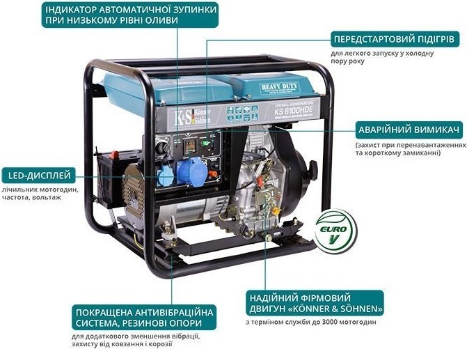 Дизельный генератор Konner Sohnen KS 6100HDE – это надежный автономный источник электропитания, предназначенный для обеспечения стабильной энергии в доме, на строительной площадке или в удаленных участках без доступа к сети. Генератор рассчитан на выходное напряжение 230 В, его мощность составляет 5.5 кВт максимально, что позволяет питать бытовые приборы, электроинструменты или оборудование средней мощности. Система электростартера делает запуск простым и быстрым, а предстартовый подогрев способствует уверенному запуску даже в холодную погоду. Конструкция соответствует экологическому стандарту EURO V, снижая уровень вредных выбросов. Вес обеспечивает хороший баланс между мобильностью и стабильностью при эксплуатации.