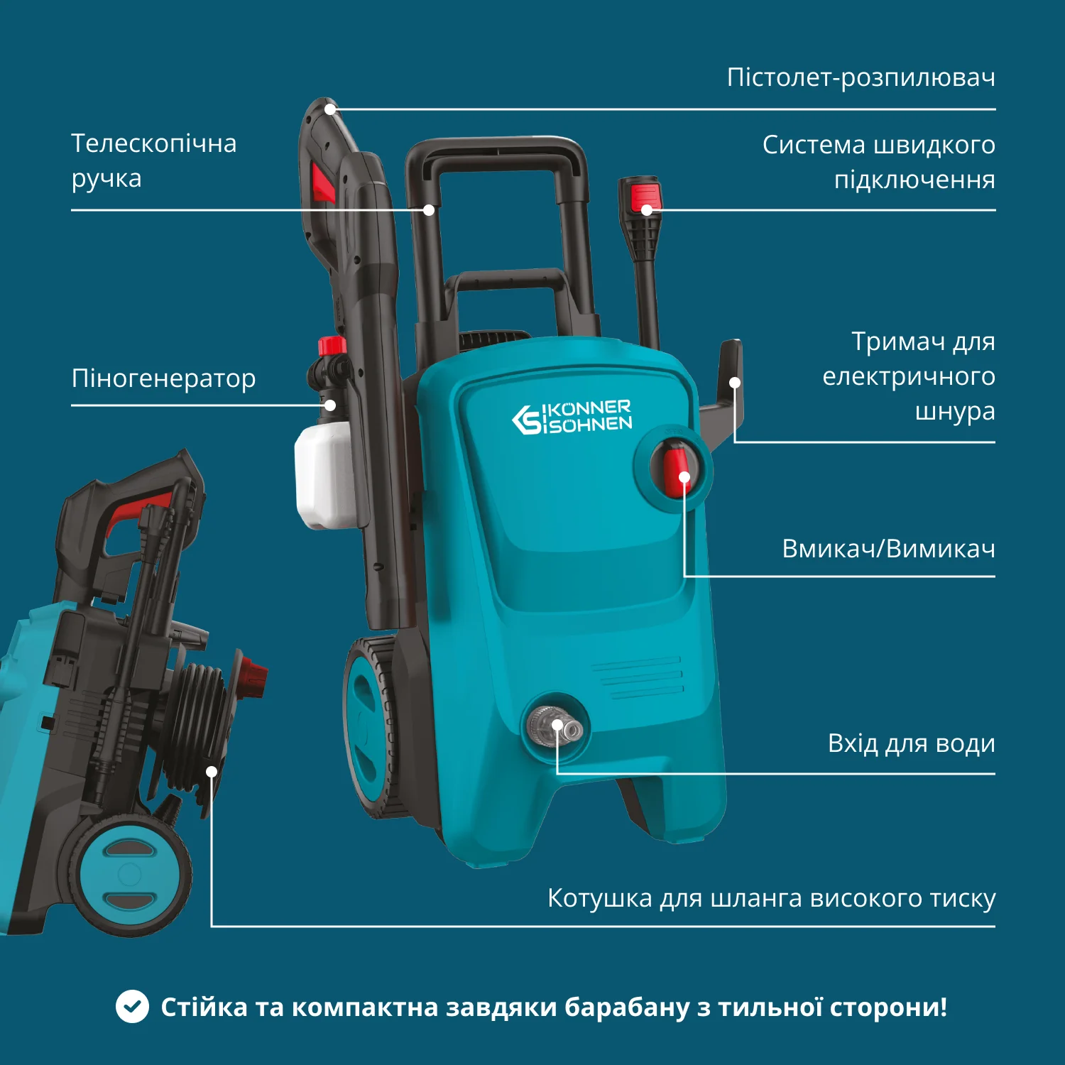 Корпус оборудован барабаном для шланга высокого давления, защищающим его от перегибов и облегчающим хранение. Телескопическая ручка с транспортными колесами обеспечивает мобильность и удобство перемещения. Роторная насадка удаляет стойкие загрязнения из камня, бетона и металла, а пенная насадка (пенообразователь) равномерно наносит густую пену для мытья автомобилей и техники. Алюминиевый корпус насоса с поршнями из нержавеющей стали повышает износостойкость и продлевает срок службы устройства при регулярной эксплуатации.