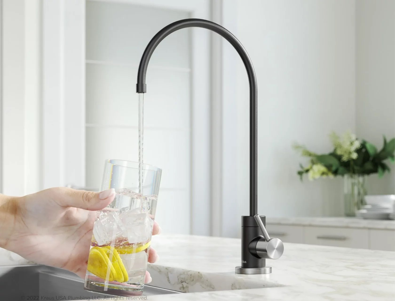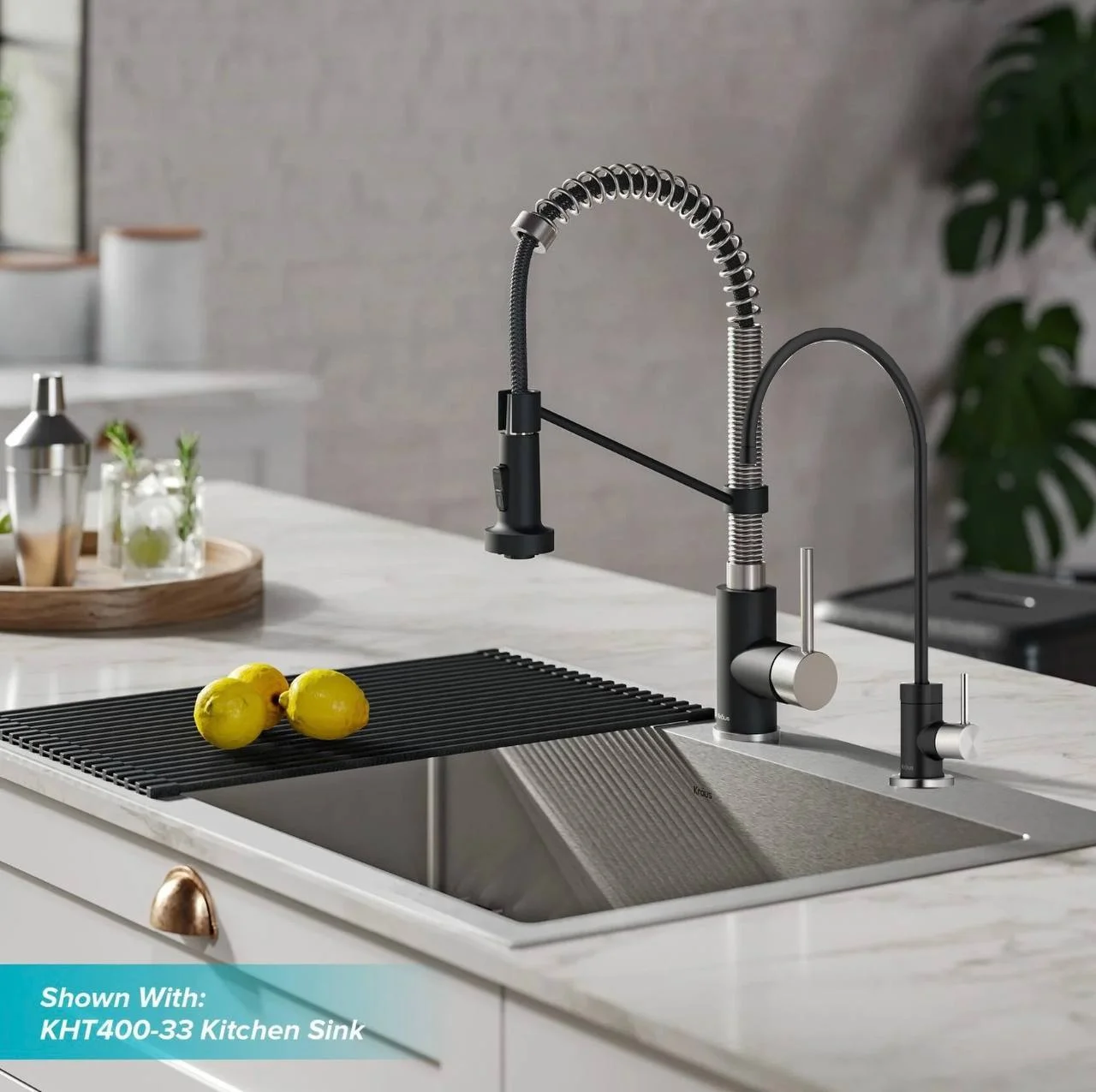Kraus KPF-1610SFSMB + FF-100SFSMB – стильный и практичный набор для кухни, сочетающий кухонный смеситель и отдельный кран для фильтрованной воды в одном решении. Это удобный выбор для тех, кто хочет иметь и обычную и очищенную воду, не перегружая пространство лишними элементами.