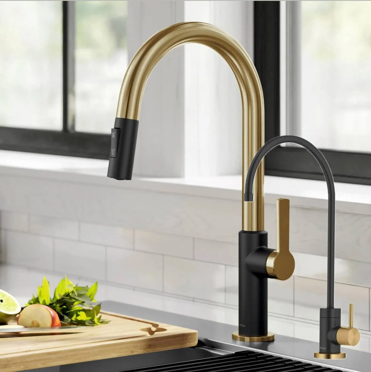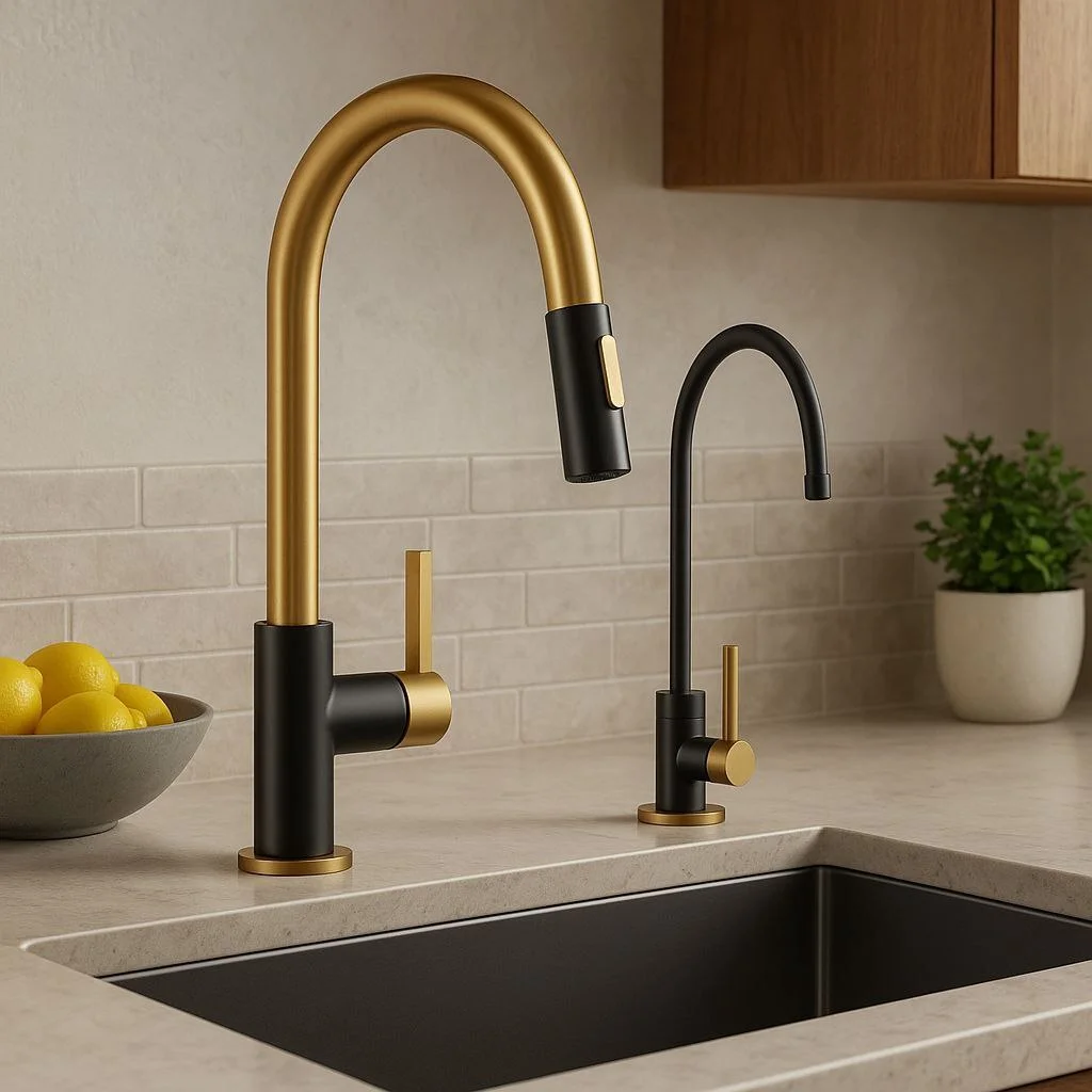 Kraus KPF-2820BBMB + FF-100BBMB – стильный и практичный набор для кухни, сочетающий кухонный смеситель и отдельный кран для фильтрованной воды в одном решении. Это удобный выбор для тех, кто хочет иметь и обычную и очищенную воду, не перегружая пространство лишними элементами.