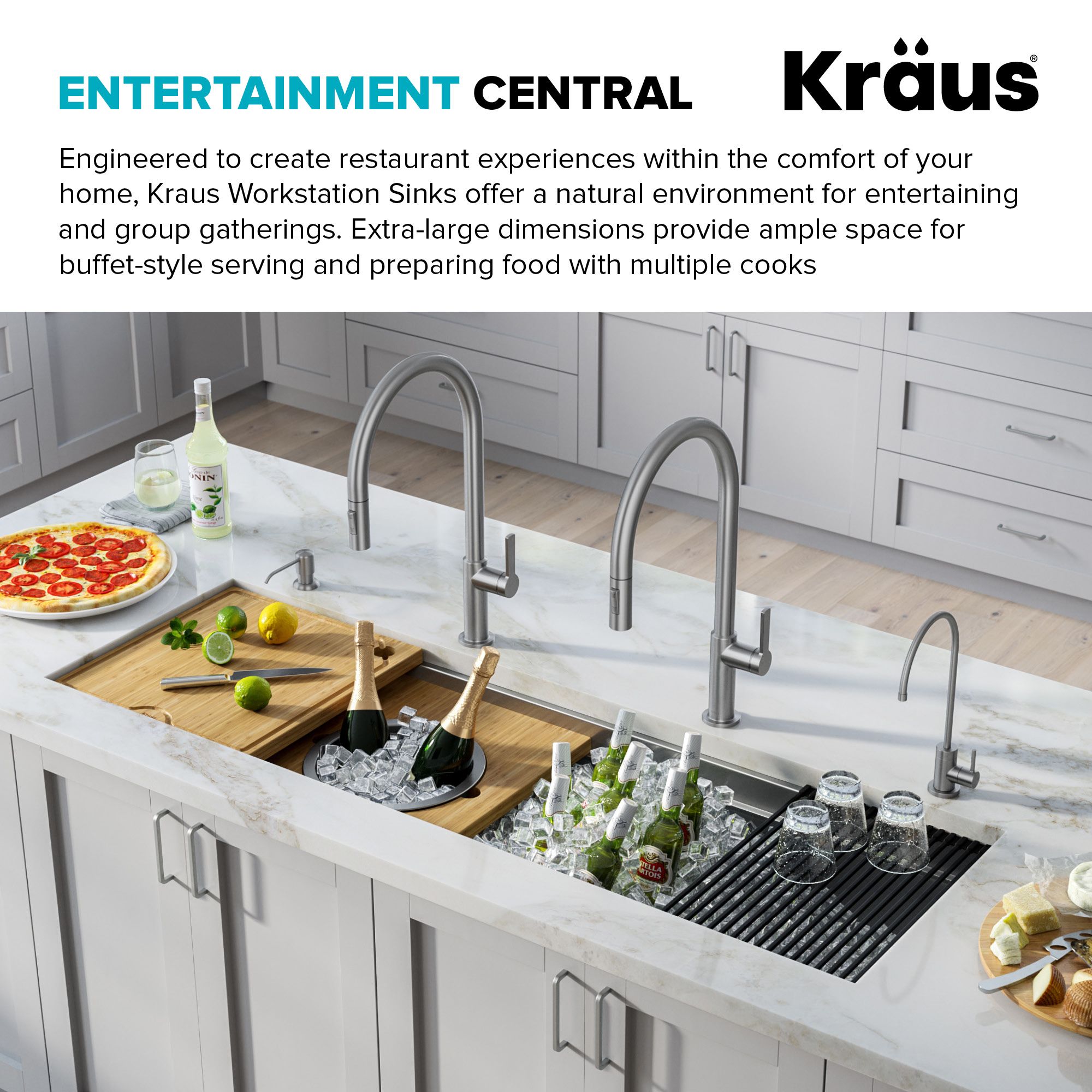 Инновационная двухуровневая система выступов позволяет перемещать аксессуары по раковине на двух уровнях, удваивая рабочее пространство и упрощая выполнение всех ваших кухонных задач, от приготовления еды до уборки. К сверхмощной мойке прилагается набор из 10 аксессуаров премиум-класса, который включает в себя твердую бамбуковую разделочную доску, набор сервировочных досок с чашей для смешивания и дуршлагом, решетку для посуды из нержавеющей стали и универсальный свертываемый сушильный коврик, который позволяет вам работать сразу раковину, не занимая столешницу. Наклонное дно с канавками направляет воду в слив, чтобы обеспечить полный дренаж.