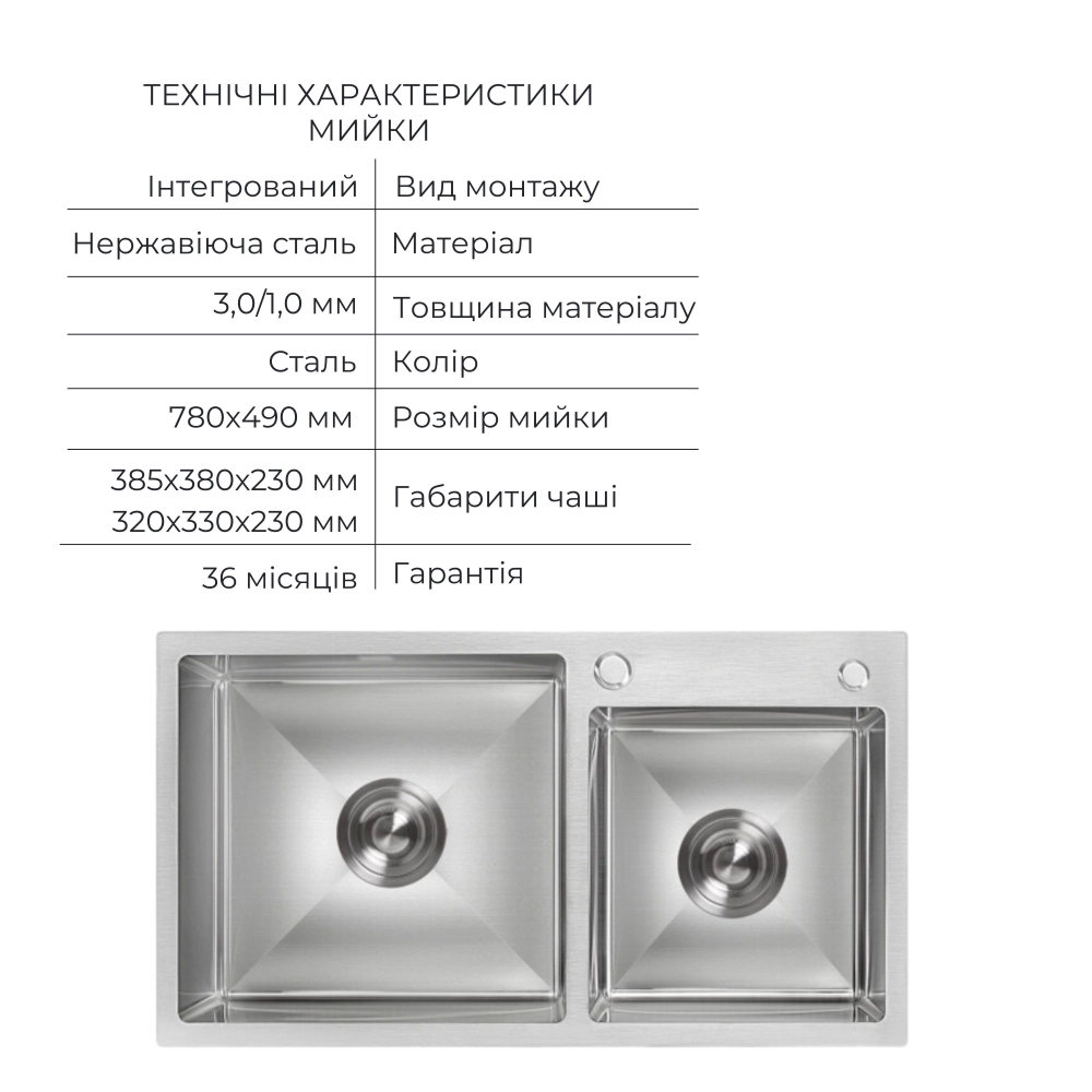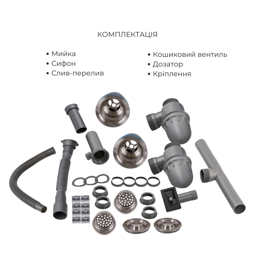 | Комплектация | корзинчатый вентиль, сифон, крепления, дозатор, сушка |