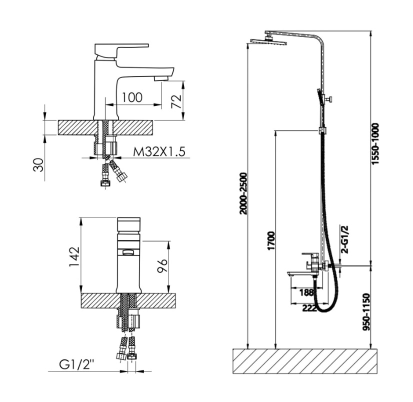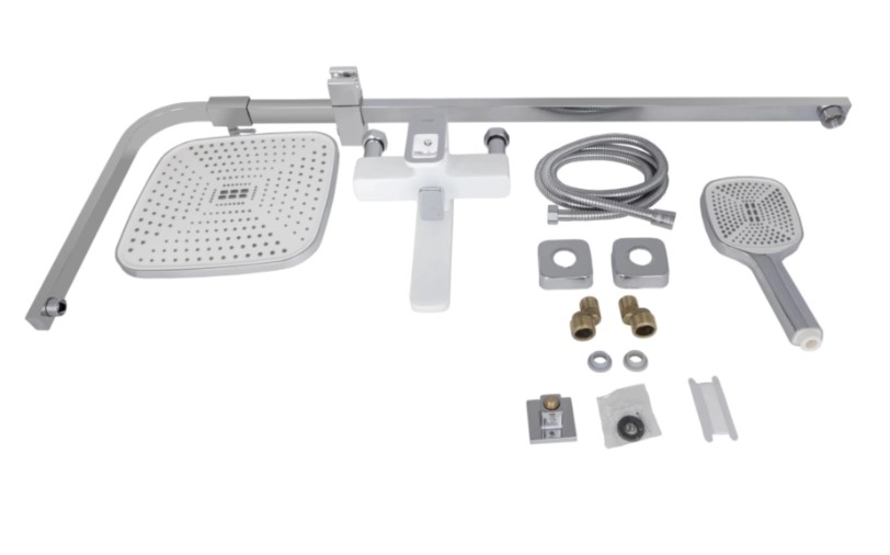 | Комплектация | смеситель, кронштейн для верхнего душа, ручной душ, кронштейн для ручного душа, душевой шланг, штанга, крепление, смеситель, гибкая подводка, крепление |