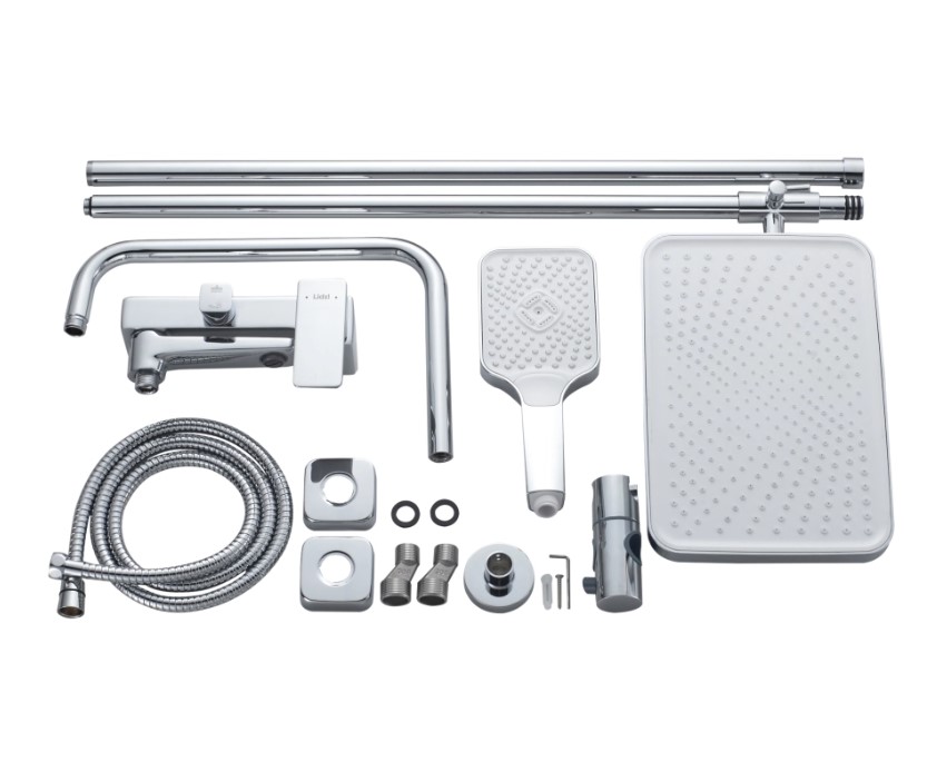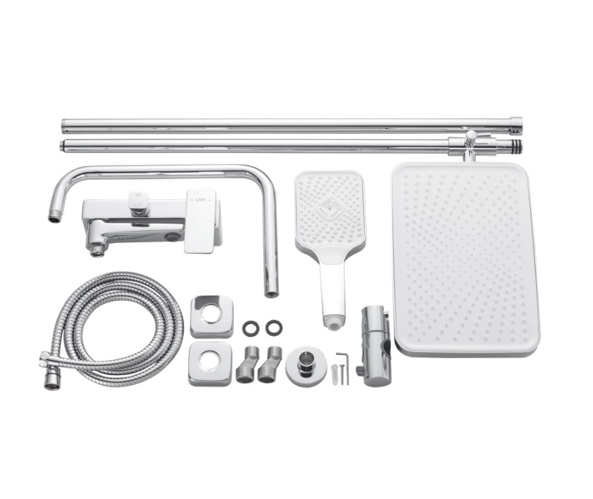 | Комплектация | смеситель, излив, душевая стойка - 3 секции, верхняя воронка, ручная воронка, душевой шлан, декоративные чашки, эксцентрики, уплотнительные прокладки, держатель для ручной воронки, крепеж для стойки |