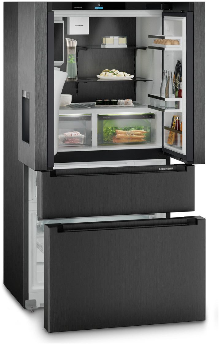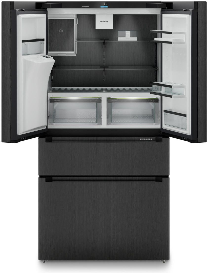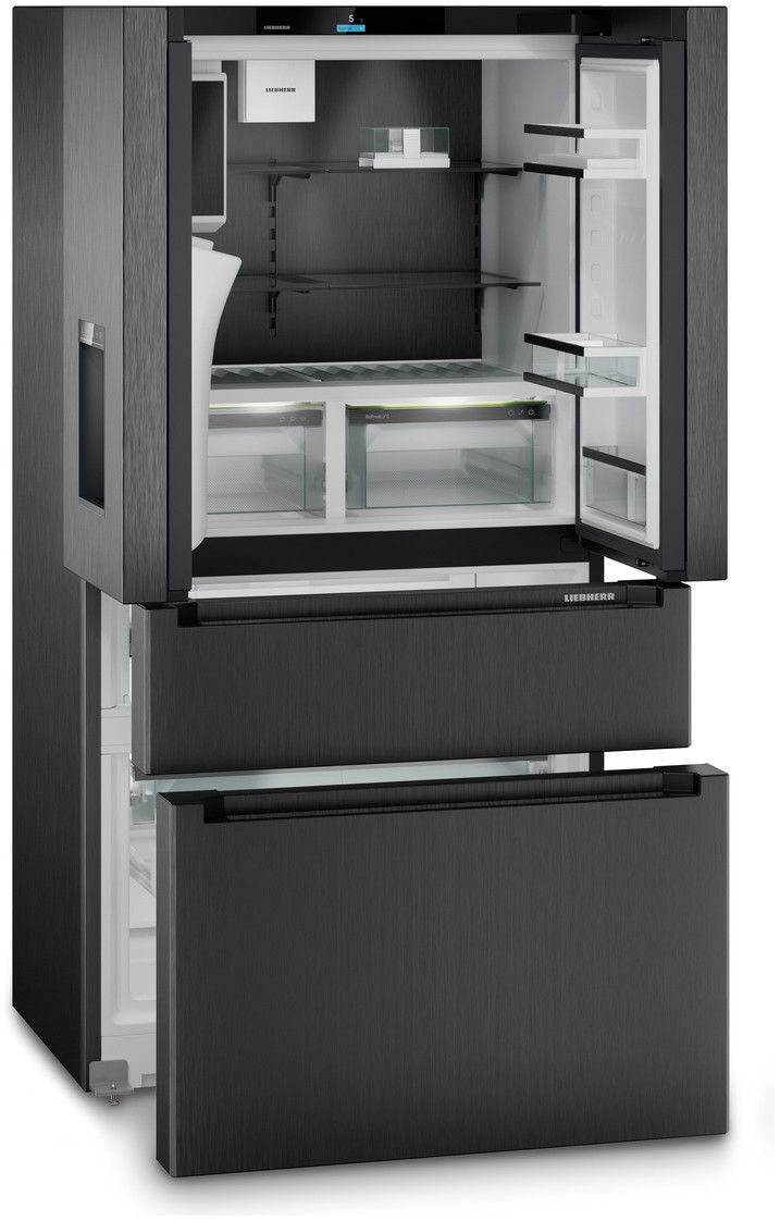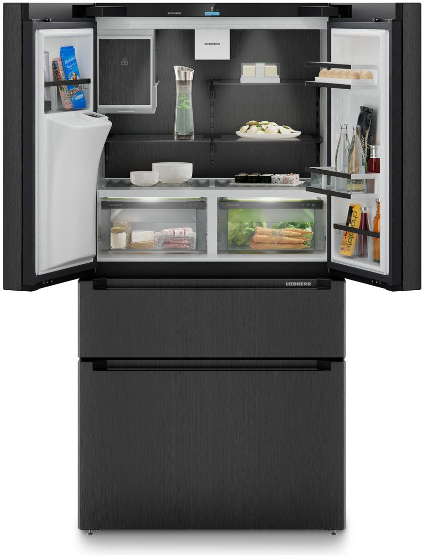 Черная поверхность из нержавеющей стали делает этот холодильник Liebherr эксклюзивным и привлекательным элементом интерьера. Дверцы легко открываются и закрываются – даже по отдельности. Центр подачи воды и льда обеспечит вас холодной водой, кубиками льда и колотым льдом в любое время.