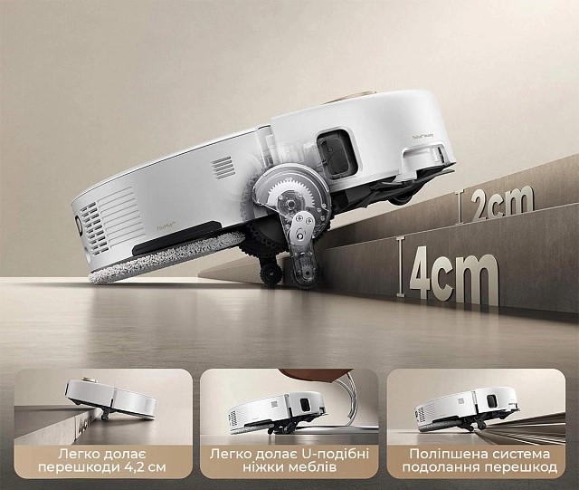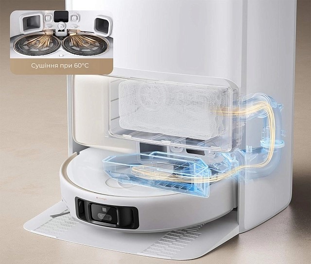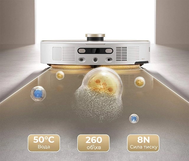| Особенности | 130 мин работы от аккумулятора, 70 мл объем бака для воды, 4 л объем резервуара для чистой воды в базе, 3,5 л объем резервуара для отработанной воды в базе, совместимость с голосовыми ассистентами, запоминание этажей, мультикартография, движение робота на карте, видеомониторинг помещения, автоувеличение мощности на коврах, возврат на базу из любой комнаты, выбор комнаты (зоны) уборки, персонализация уборки каждой комнаты, режим Авто, полное самообслуживание, возобновление уборки с того же места после подзарядки, автоматическая сушка насадок |