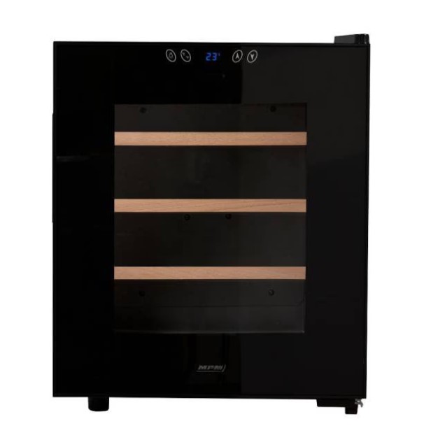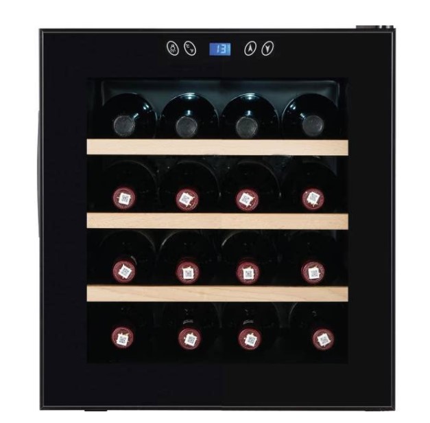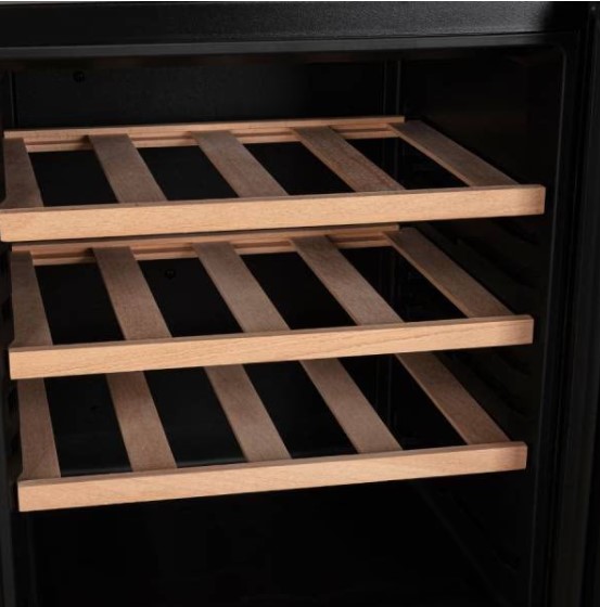 Винный холодильник имеет полезный объем 45 л и рассчитан примерно на 16 стандартных бутылок вина. Внутри расположены деревянные полки, обеспечивающие правильное размещение бутылок и способствующие циркуляции воздуха. Электронное управление с дисплеем позволяет точно установить температуру в диапазоне 11–18C, подходящую для хранения красного, белого и игристого вина.