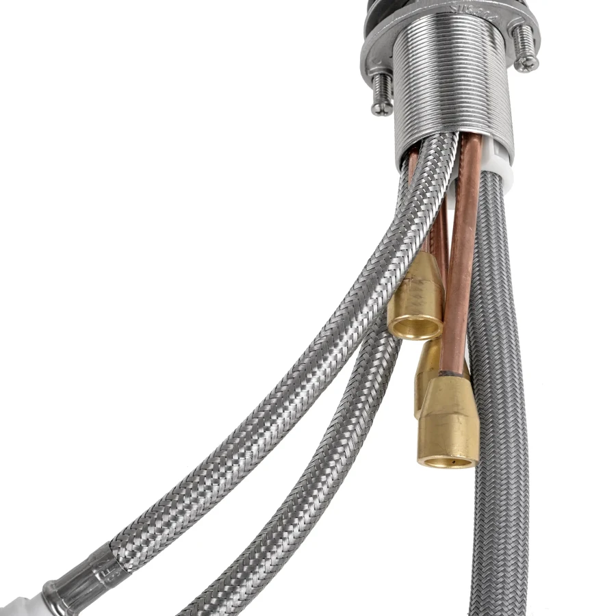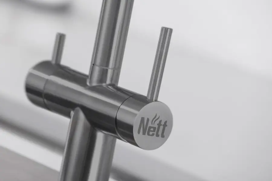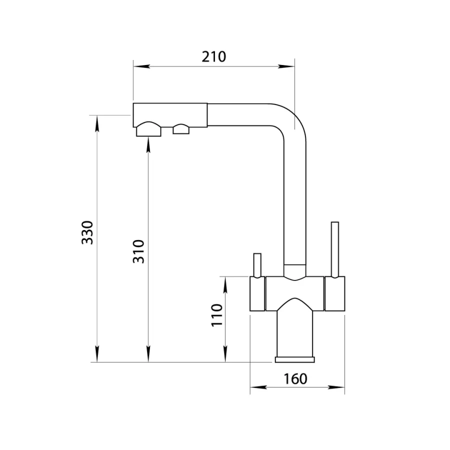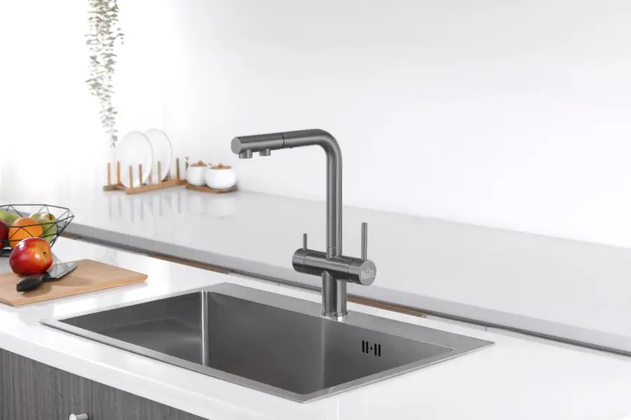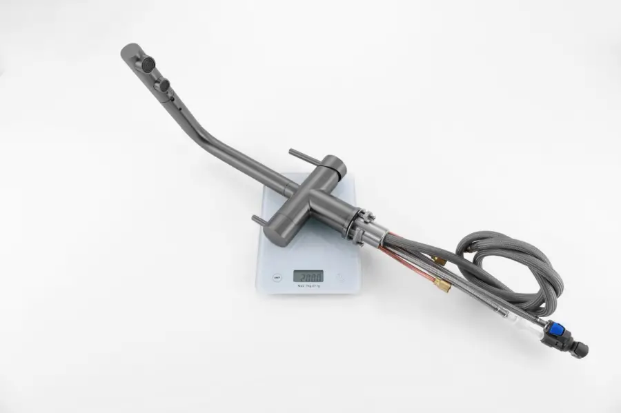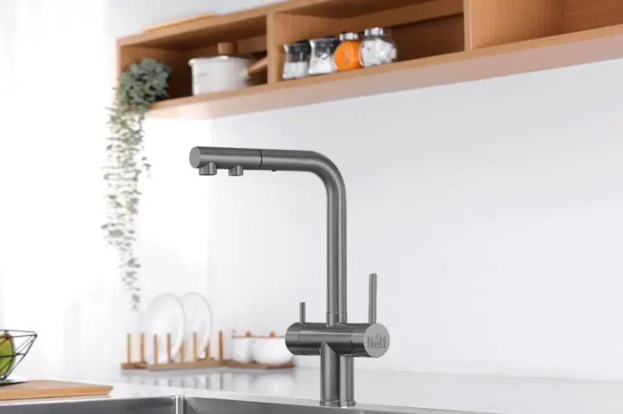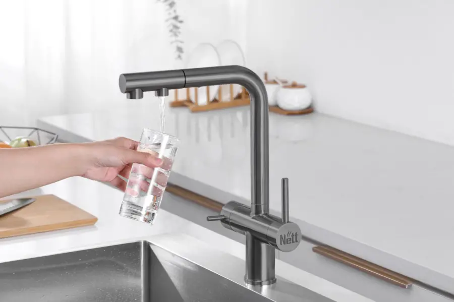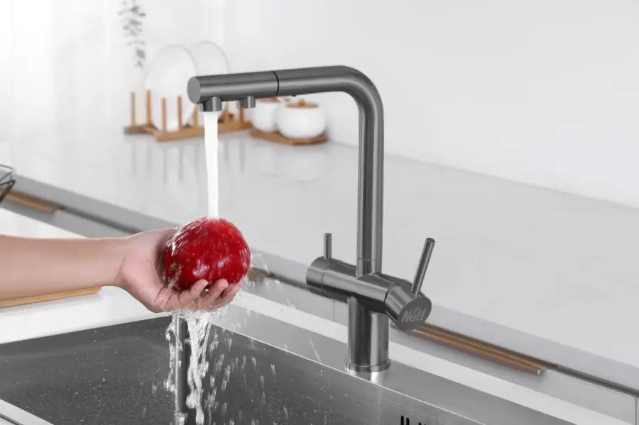 Этот тип смесителя спроектирован так, чтобы подключаться к как фильтрованной, так и нефильтрованной воде. Он снабжен двумя рычагами для контроля подачи воды: левый для фильтрованной и правый для смешанной горячей и холодной воды.