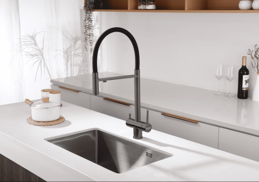 Корпус выполнен из нержавеющей стали в стильном графитовом цвете, что гарантирует прочность, коррозионную стойкость и длительный срок службы, а поворотный гибкий излив обеспечивает удобное мытье посуды и наполнение высоких емкостей. Модель оснащена комплектом подключения, монтажными шлангами и гарантийным талоном для быстрой установки и доверия к эксплуатации. GFGr-56 – это практичное, многофункциональное решение для современной кухни, сочетающее удобство, стильный внешний вид и возможность подключения к фильтрованной воде.