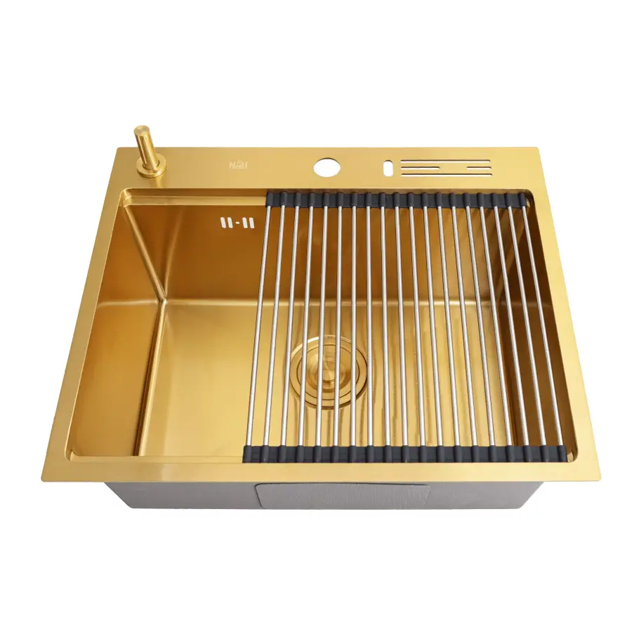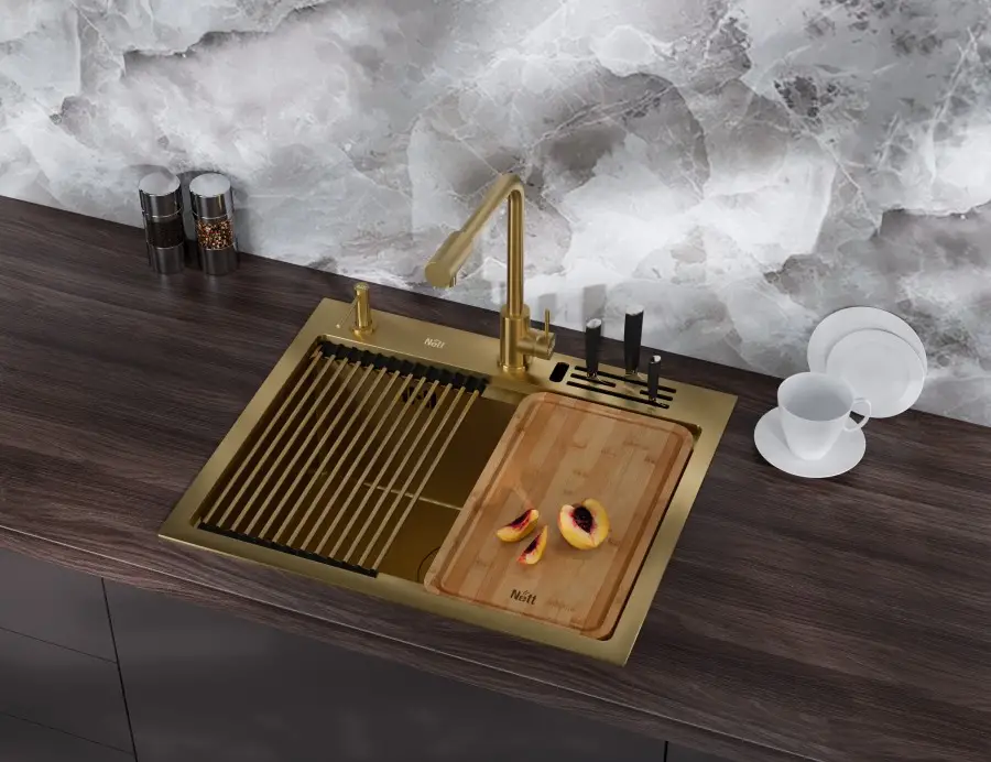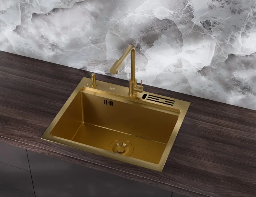 Мойка из нержавеющей стали AISI 304 толщина стали равна 1 мм PVD (Nano) покрытие золото. В бортике есть отверстия для ножей.