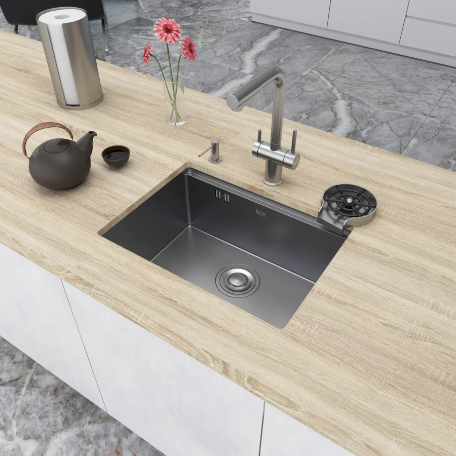 Толщина материала в 1.5 мм делает мойку более прочной, устойчивой к царапинам и менее шумной в использовании.