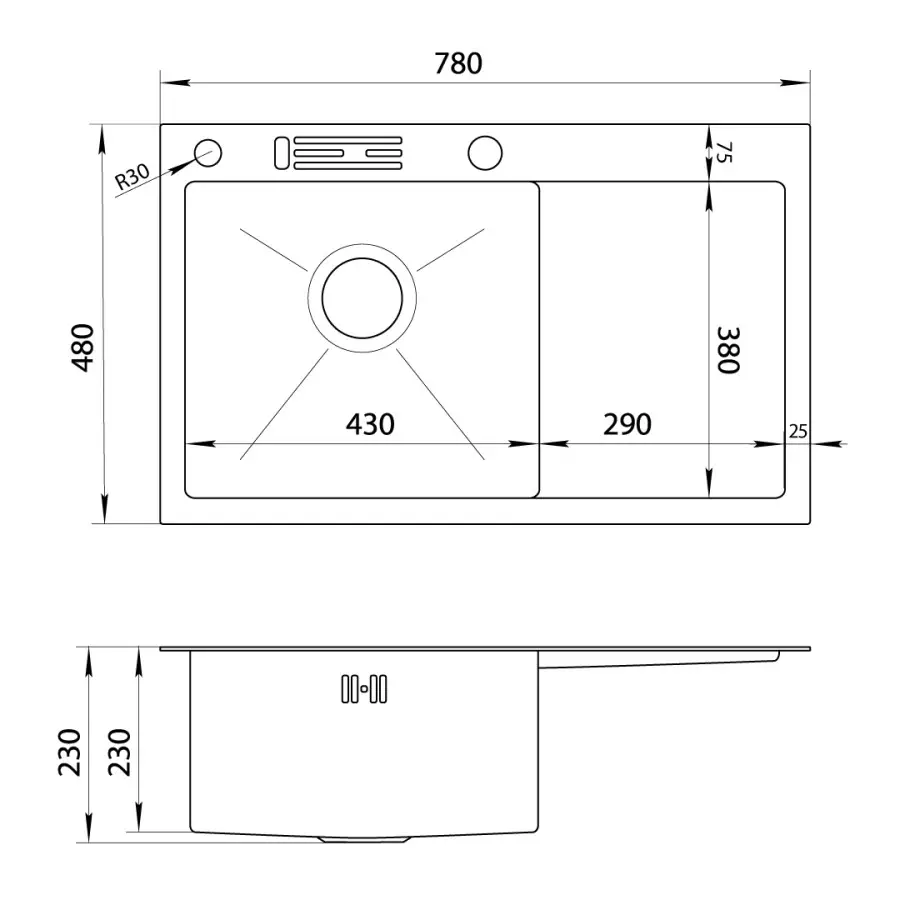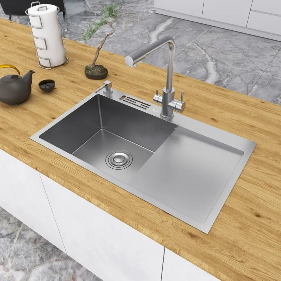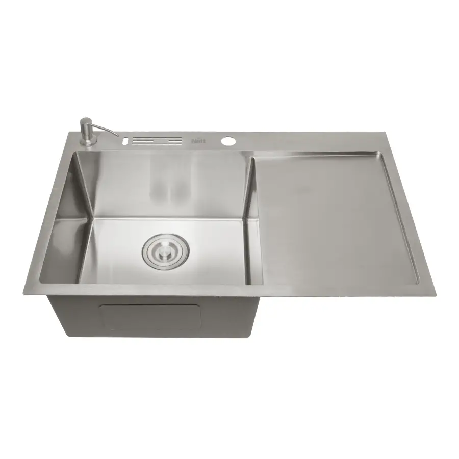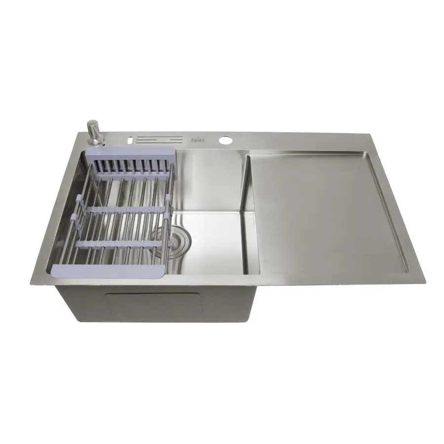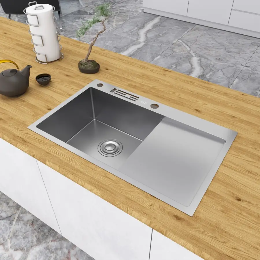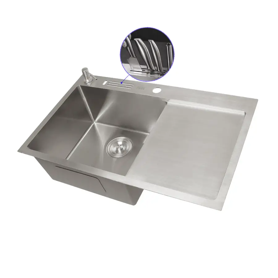 Мойка из нержавеющей стали 304 марки (состав металла, включающий 18% хрома и 8% никеля), толщина 1 мм с отверстиями в бортике для ножей