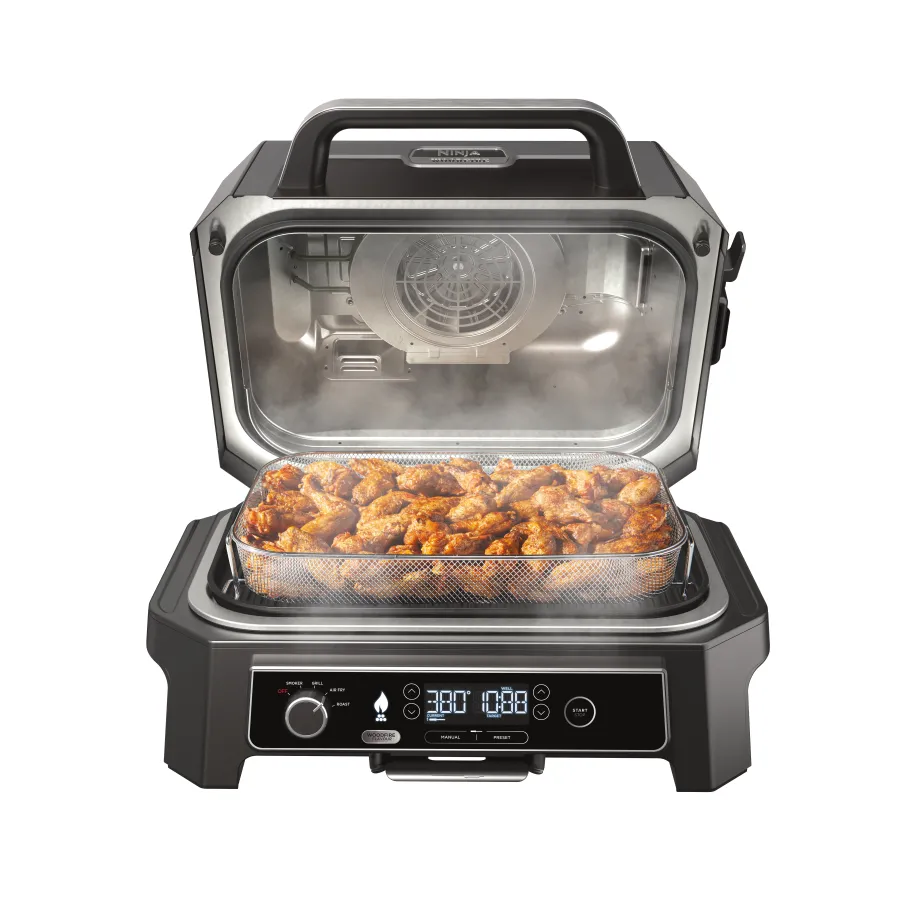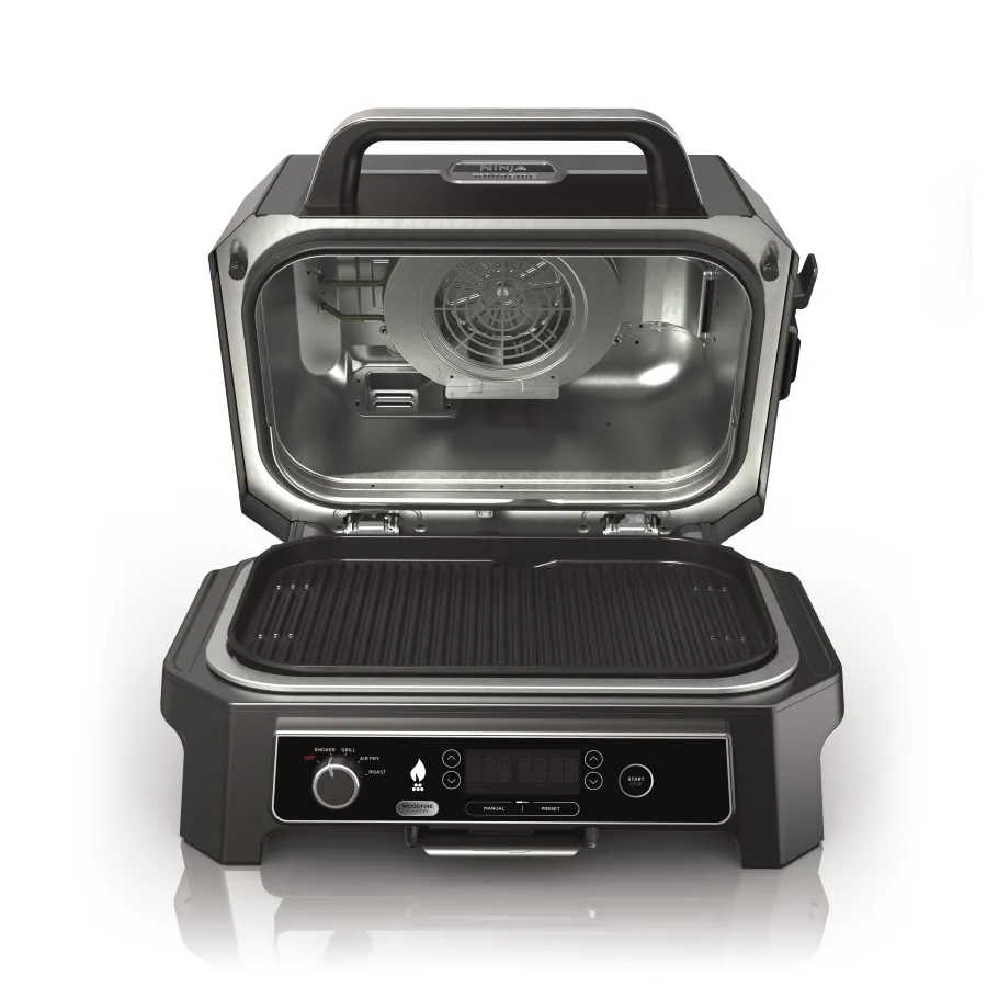 Ninja Woodfire Pro XL OG850EU – мощный электрический гриль-барбекю и коптильня премиум-класса, разработанный для настоящих поклонников вкуса дыма и барбекю в домашних условиях. Эта модель предлагает расширенный функционал: сочетание гриль-приготовления, копчение, запекание и медленное утомление, с возможностью достигать насыщенного аромата дыма благодаря передовой технологии Woodfire, симулирующей эффект открытого огня без потребности традиционного источника дыма или угля. Прибор оснащен простым цифровым управлением с интуитивными автоматическими программами и широким диапазоном температур, что позволяет готовить любые блюда – от сочных стейков и ребрышек до рыбы, овощей и даже десертов – с великолепной текстурой и равномерным прогревом. Большая камера и вместительные полки делают Ninja Woodfire Pro XL OG850EU идеальным решением для семейных застолий, барбекю-вечерок или праздничных блюд.