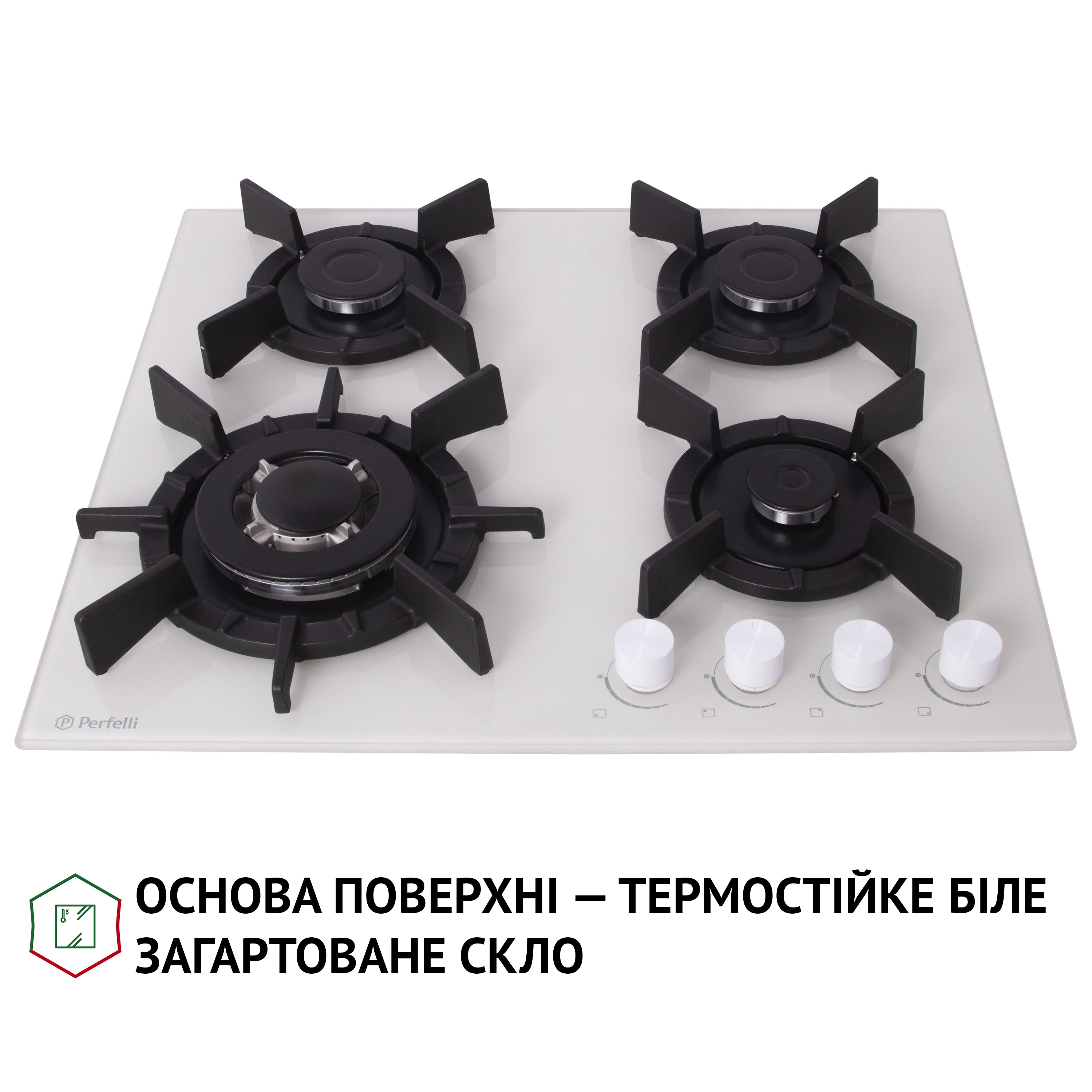 Газовая поверхность на стекле Perfelli HGG 61687 WH оборудована 4-мя конфорками разной мощности. Она станет вашей надежной помощницей в приготовлении вкусных блюд. Стандартная ширина позволяет удобно расположить варочную поверхность как на стандартной кухне, так и на маленькой.