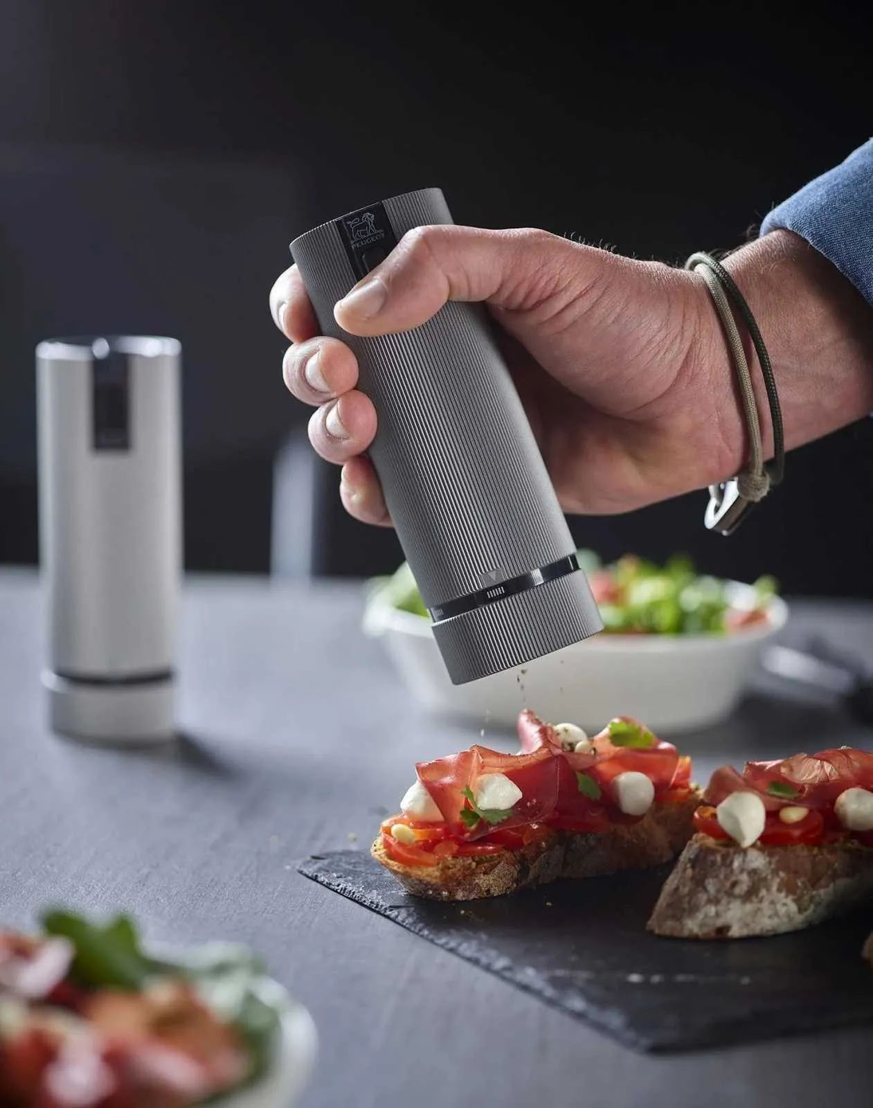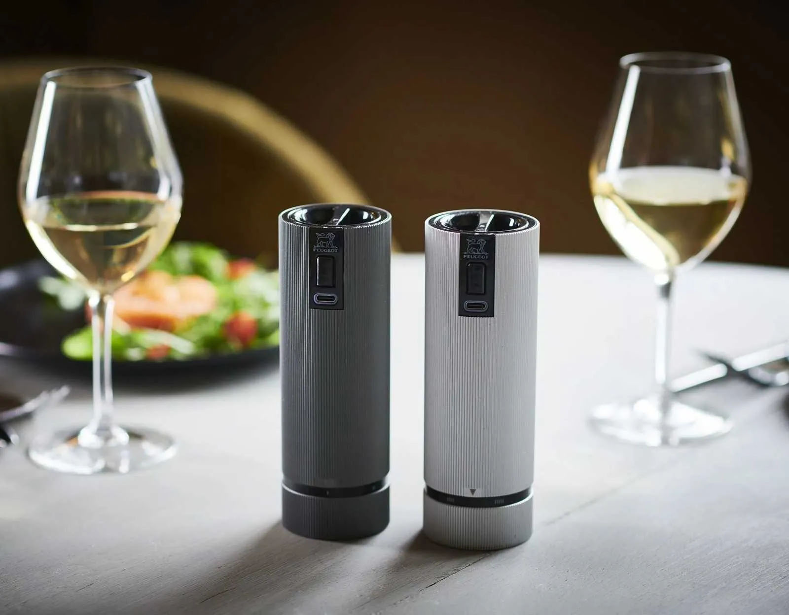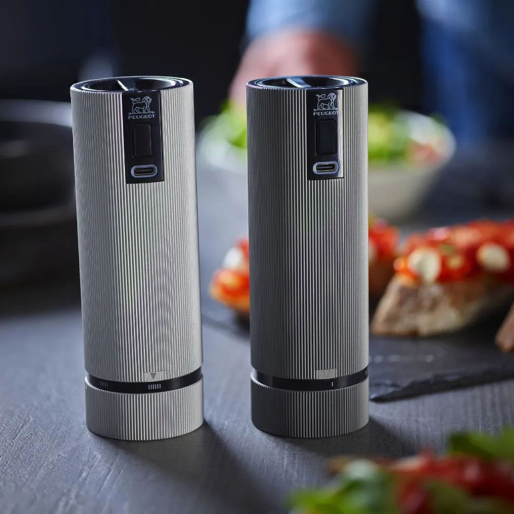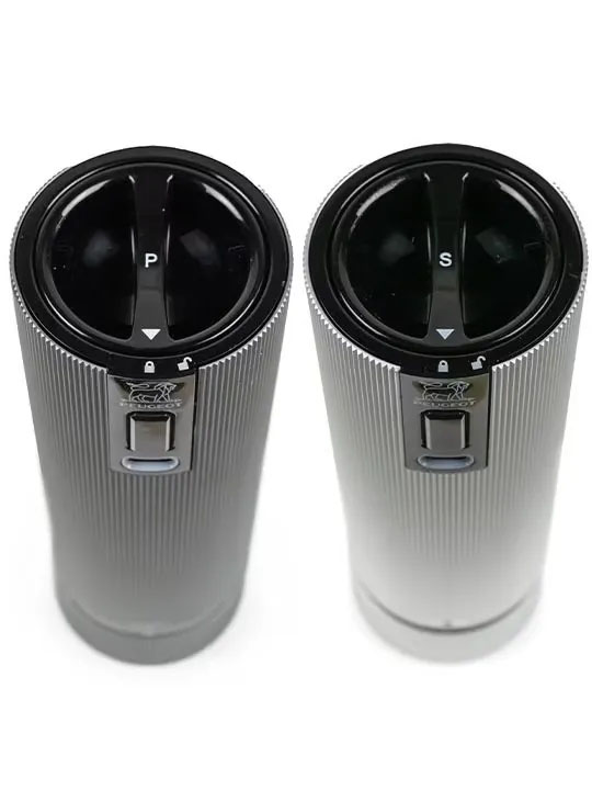 Мельницы для специй Peugeot имеют долговечные механизмы с пожизненной гарантией. Для перца используется проверенный стальной механизм, а для соли – инновационная разработка Zirconia, позволяющая получить тонкий порошковый помол, уменьшая при этом количество добавленной соли без потери вкуса. Благодаря встроенному литий-ионному аккумулятору мельницы работают эффективно, заряжаются быстро и удобно используются одной рукой. Оптимизированный резервуар с широким отверстием облегчает наполнение, а рельефный корпус обеспечивает надежный захват.