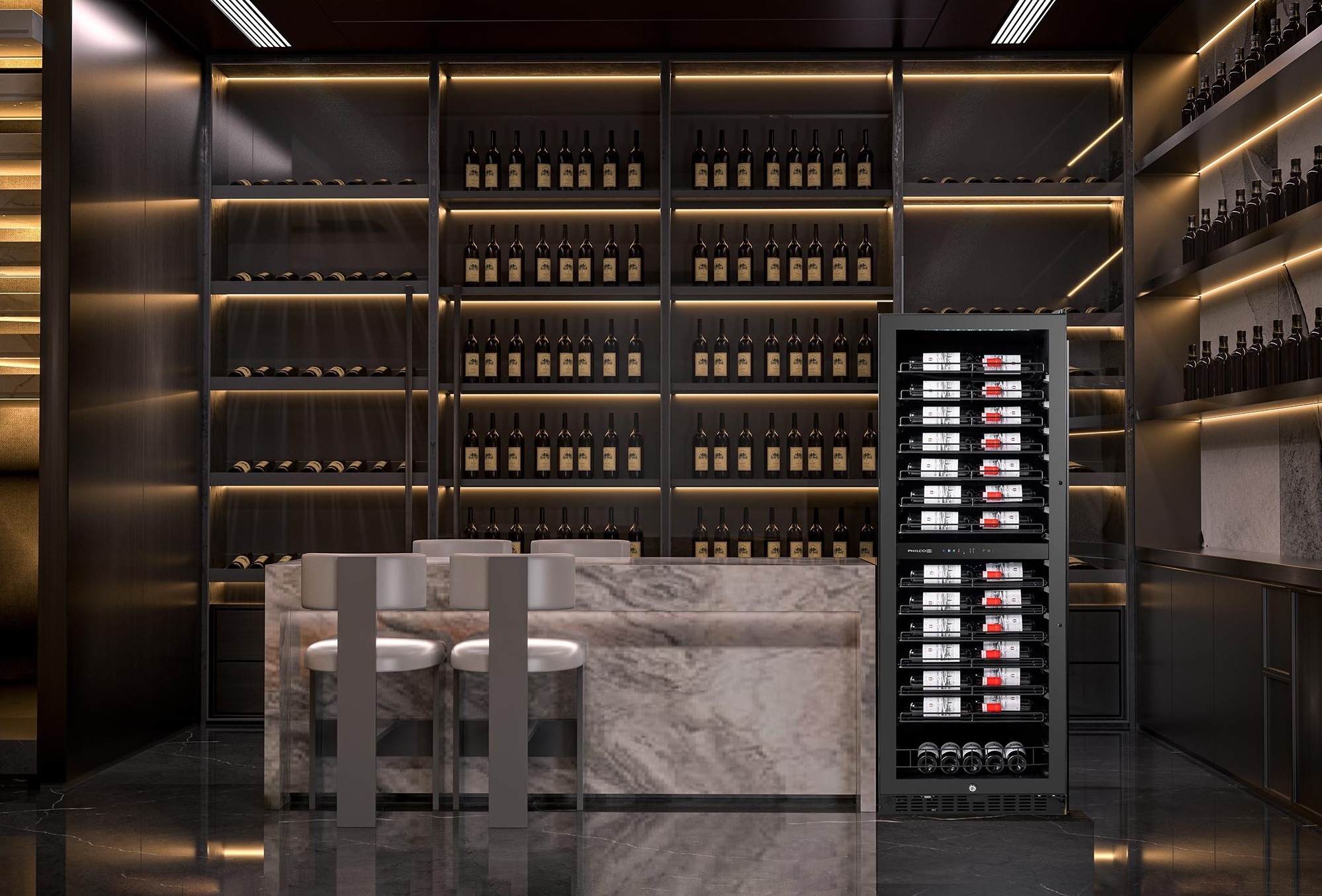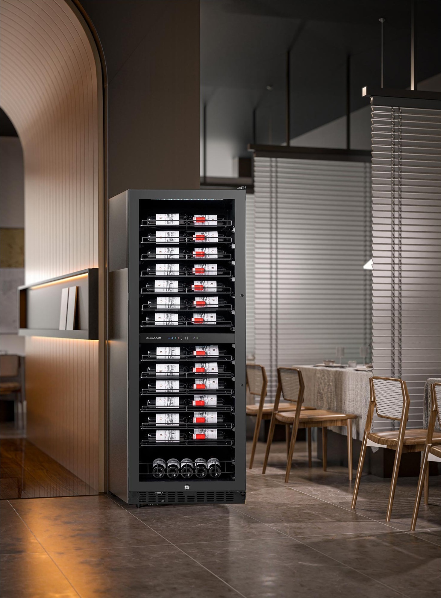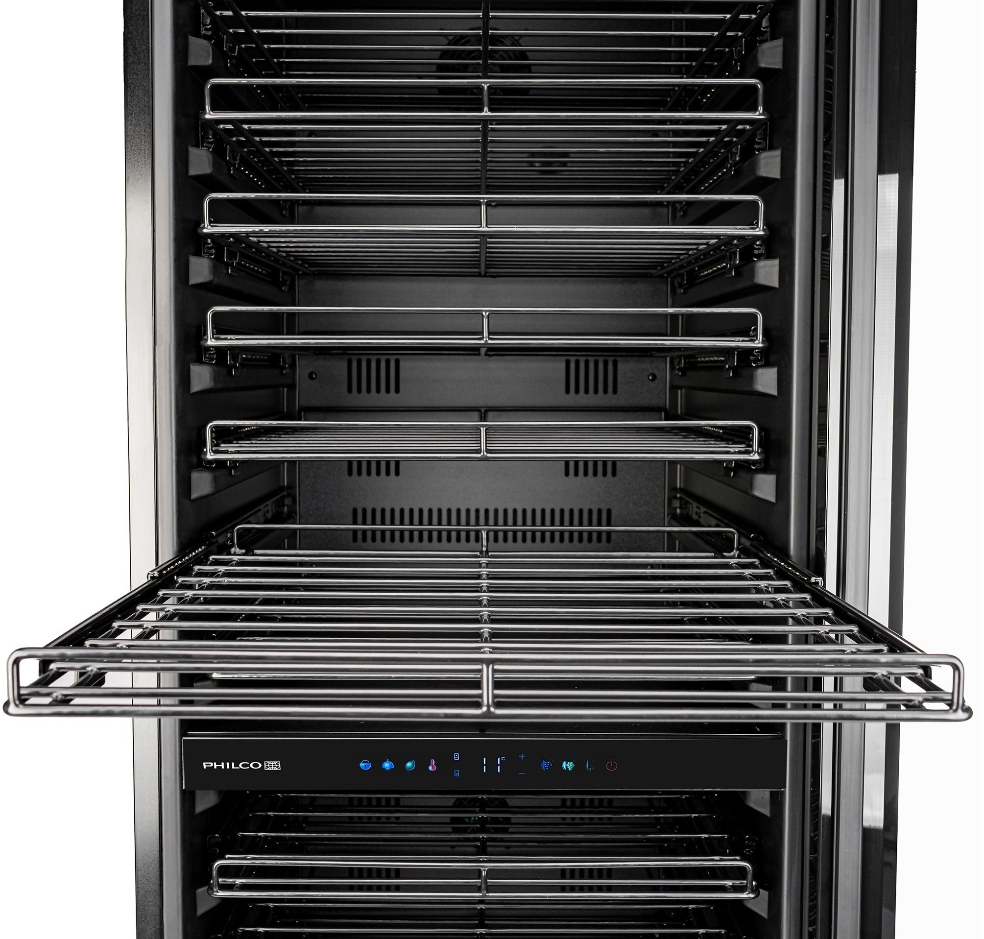 Philco PW131GDC – отдельный двухзонный винный холодильник премиум-класса, рассчитанный на хранение до 131 бутылки стандартного типа. Общий полезный объем делает его одним из самых вместительных в своем классе при ширине всего 60 см. Две независимые температурные зоны с отдельными цветными сенсорными панелями позволяют одновременно хранить красные вина в нижней зоне (11–20C) и белые/розовые/игристые в верхней (5–20C).