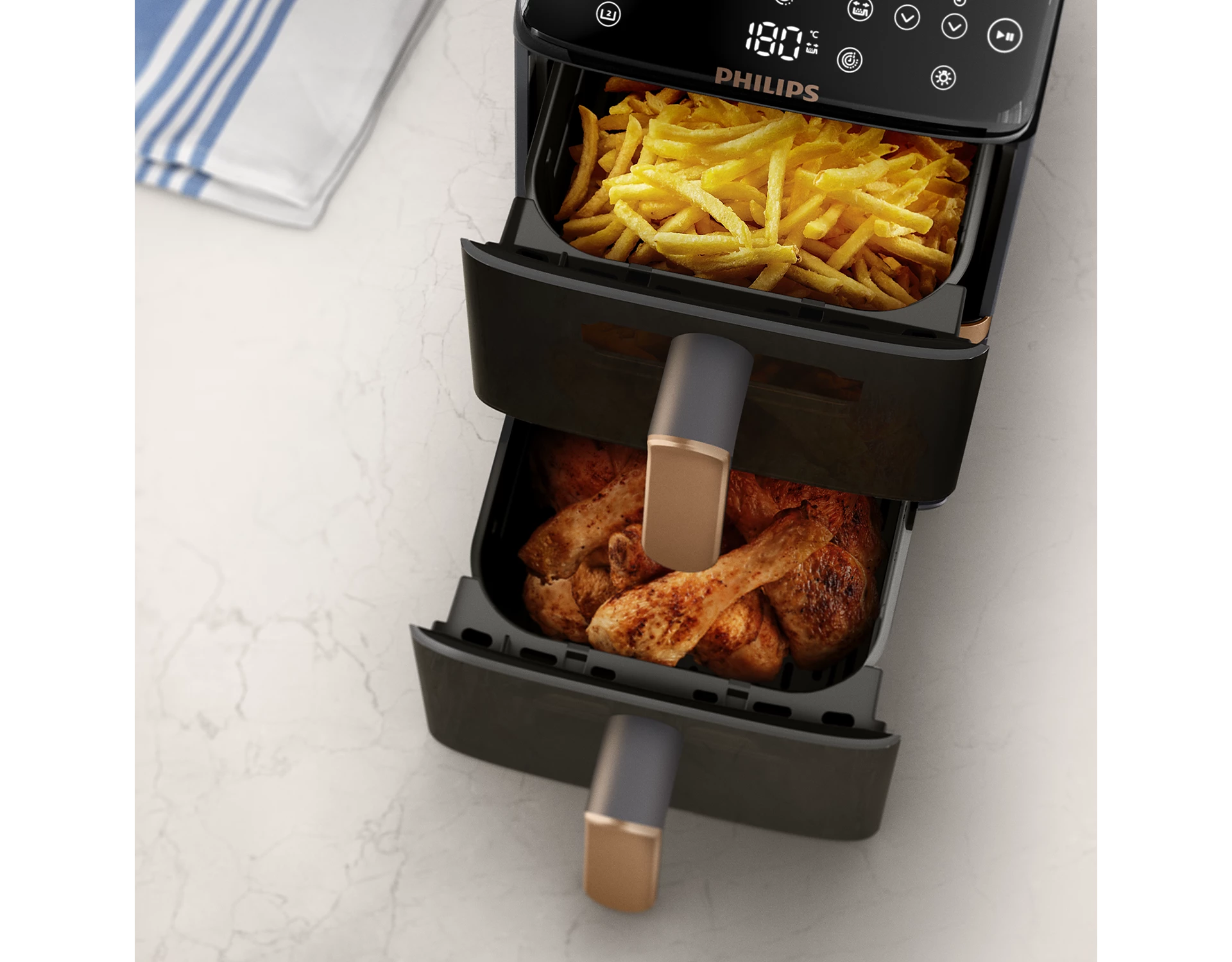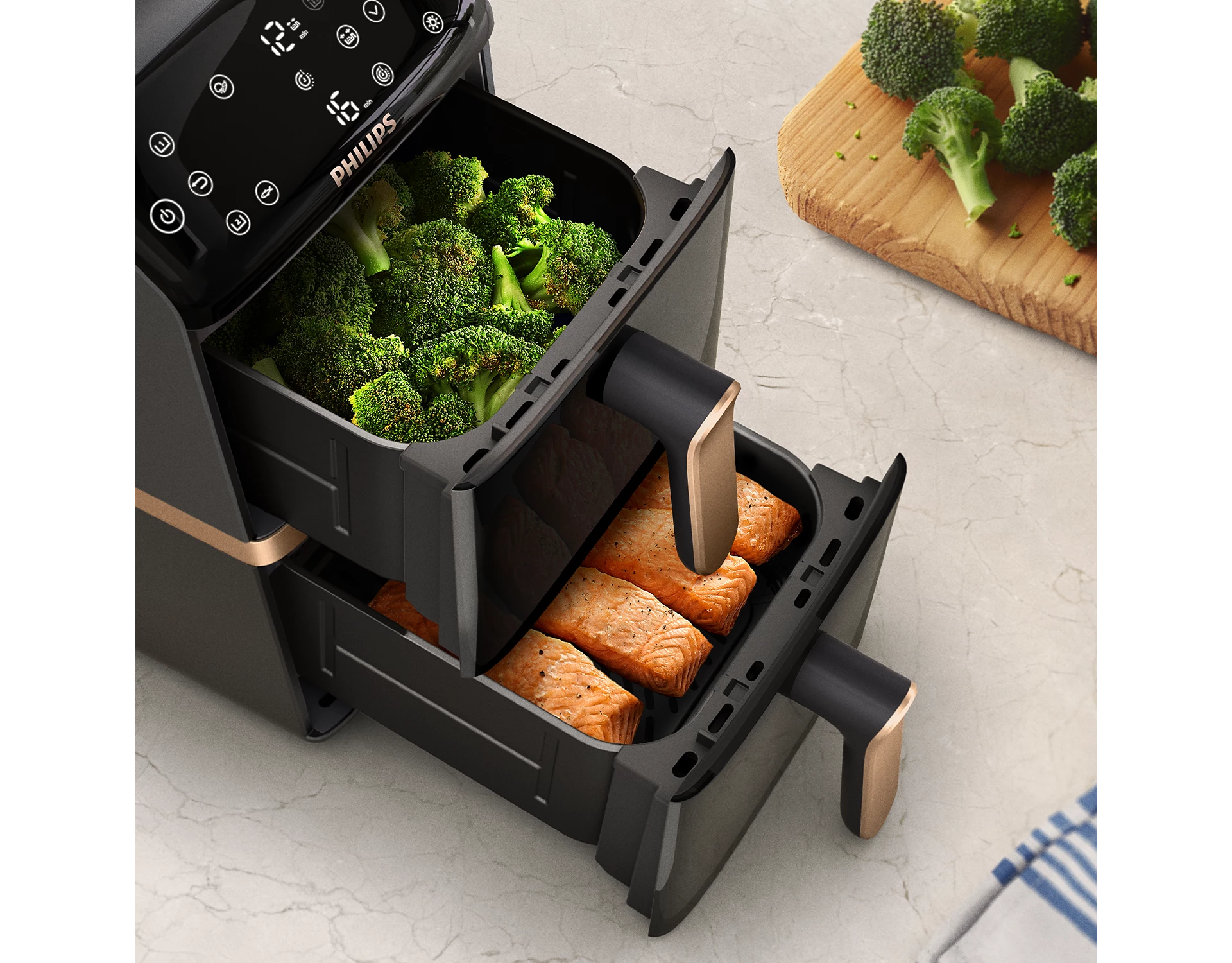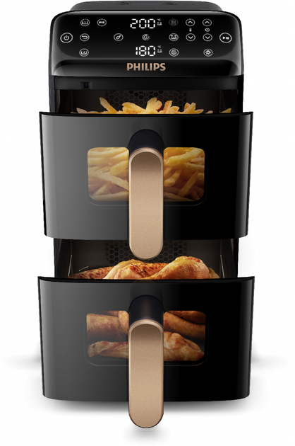 Philips Ovi Stacked Dual Basket обладает новым антипригарным покрытием без PFAS, которое является прочным, устойчивым к царапинам и легким в уходе. Все съемные части можно мыть в посудомоечной машине. Прибор обеспечивает до 40 процентов более быстрого приготовления и до 65 процентов экономии энергии по сравнению с обычной духовкой. Подключение к приложению HomeID открывает доступ к сотням рецептов с пошаговыми инструкциями и персонализированными настройками для более удобного приготовления.