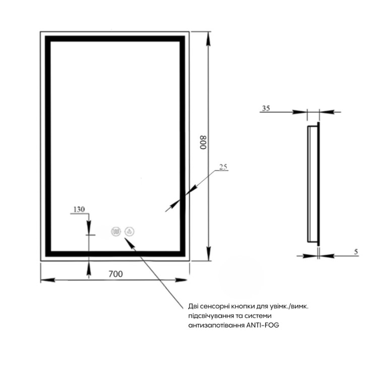 Зеркало Qtap Mideya MI1 с антизапотеванием 700х800 QT2078DCF7080W укомплектовано светодиодной LED лентой с ровным, насыщенным свечением холодного белого цвета. LED лента не создает негативного влияния на зрение человека. В зеркале предусмотрена функция ANTI-FOG - защита от запотевания. Управление осуществляется двумя сенсорными кнопками на передней части зеркала, диммер позволяет регулировать яркость подсветки.