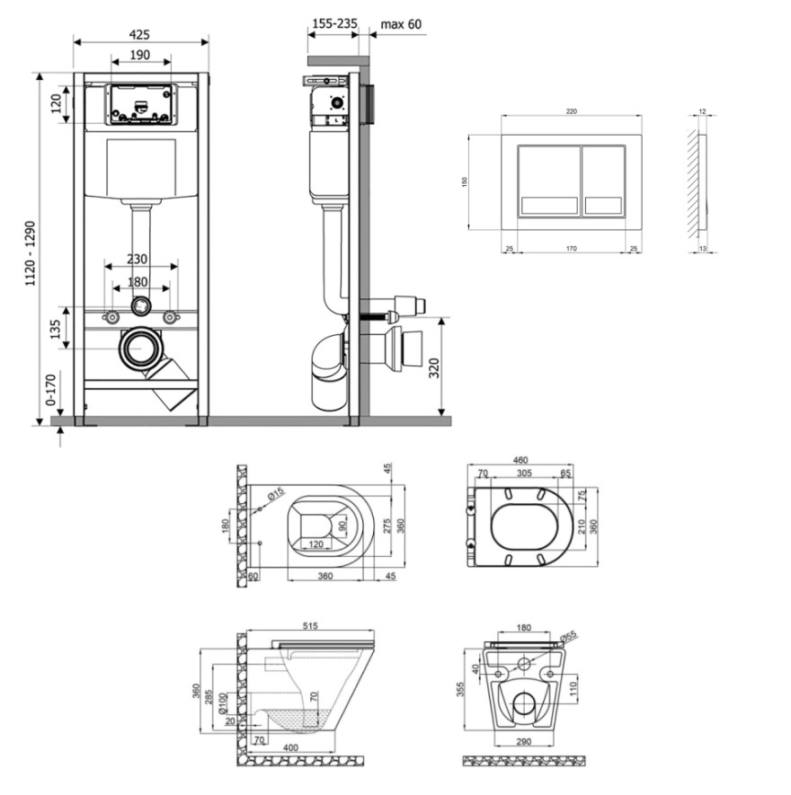 | Материал | металл/ABS пластик - инсталляция, ABS пластик - панель смыва, керамика - унитаз, дюропласт - сиденье для унитаза |