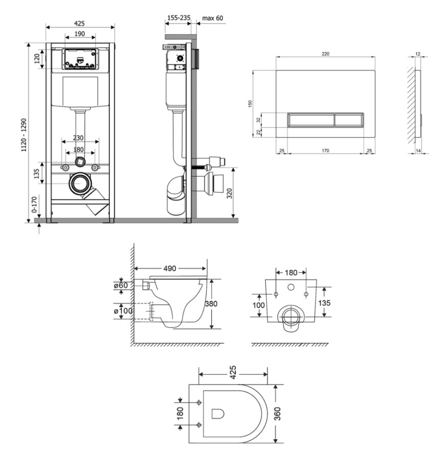 | Материал | металл/ABS пластик - инсталляция, ABS пластик - панель смыва, керамика - унитаз, дюропласт - сиденье для унитаза |