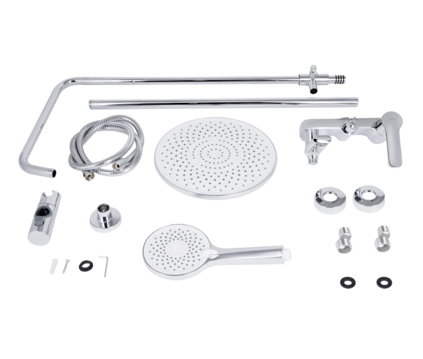 | Комплектация | смеситель, кронштейн для верхнего душа, лейка для верхнего душа, кронштейн для ручного душа, лейка для ручного душа, душевой шланг, душевая стойка, детали крепления |