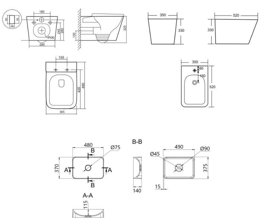 | Глубина, (см) | унитаз 49 / биде 52 / раковина 37 |