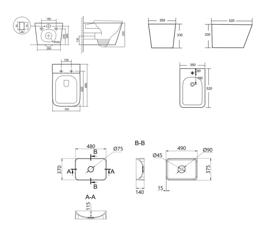 | Глубина, (см) | унитаз 49 / биде 52 / раковина 37.5 |