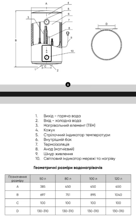 | Дополнительная защита | магниевый анод, предохранительный клапан (защита от избыточного давления), защита от перегрева |