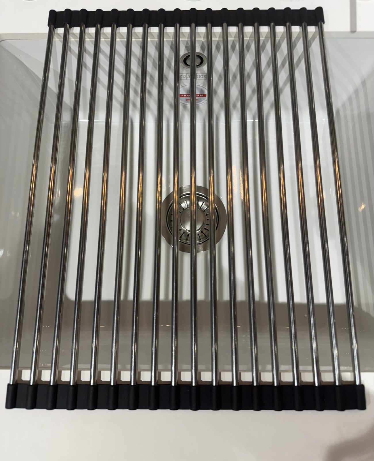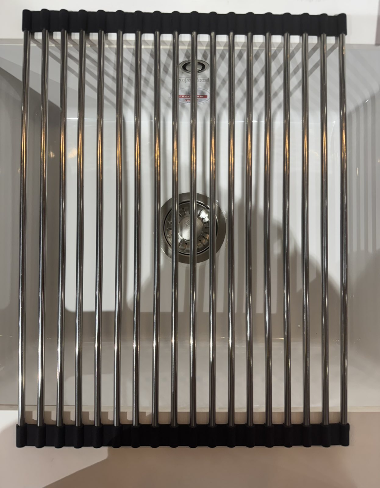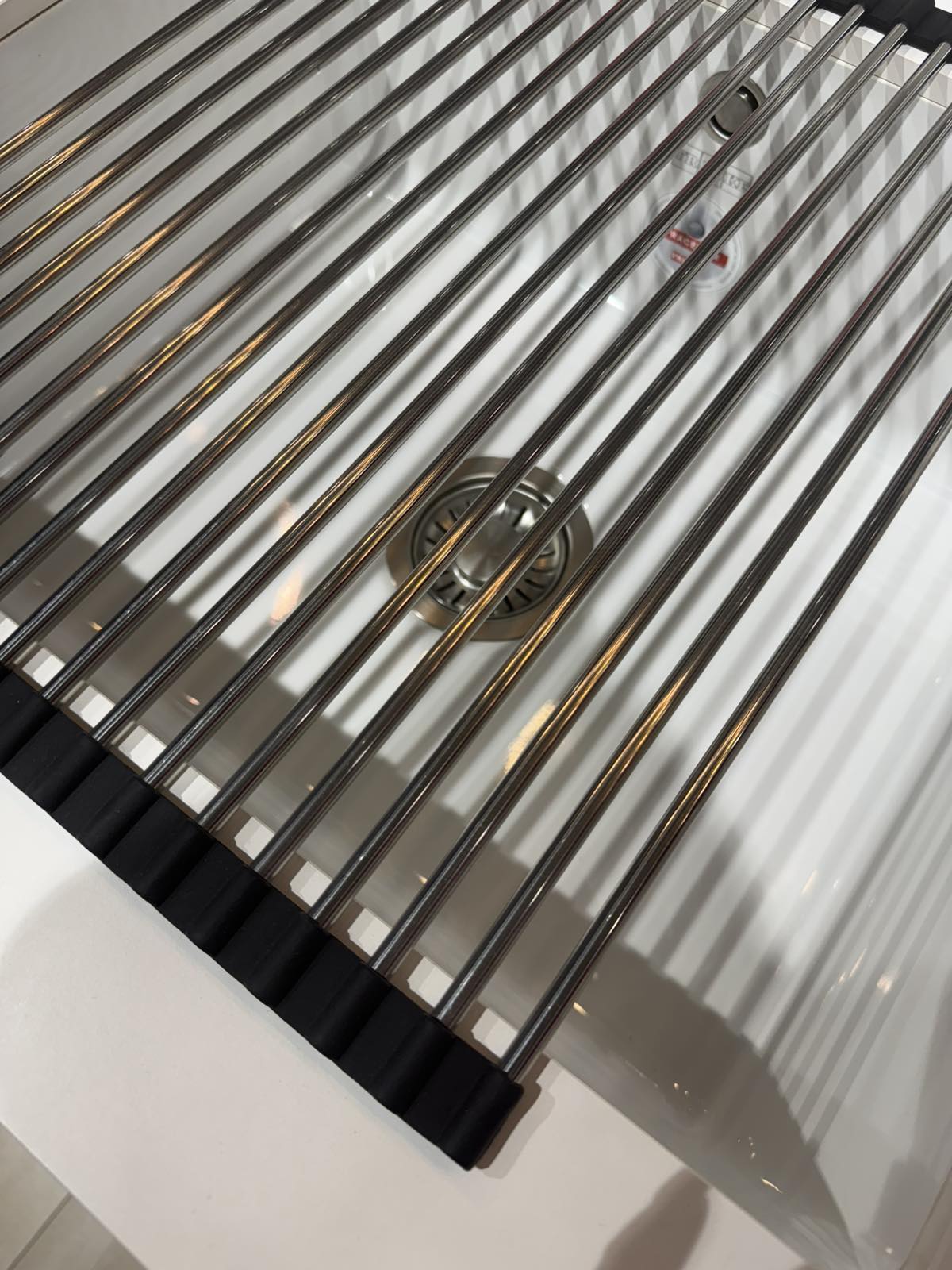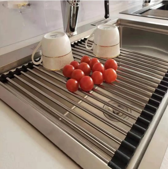 Складной коврик-решетка подходит к чувствительным поверхностями и служит защитой от царапин и перегрева столешницы, например от горячей кастрюли. Решетку можно установить сверху на мойку, так посуда будет лучше высыхать. Складная коврик решетка состоит из высококачественных стержней из нержавеющей стали, которые соединены эластичными нескользящими полосками из силикона. Таким образом, с одной стороны, она очень прочная, с другой - гибкая. Если решетка не нужна, её можно сложить, чтобы сэкономить место, или положить её на край мойки, или убрать в шкаф.